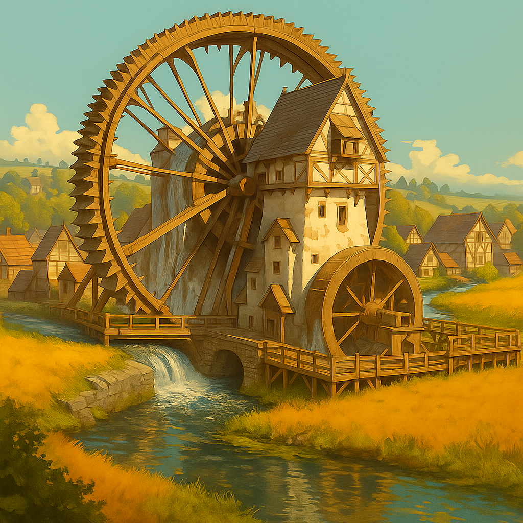 The mill itself is a sturdy two-story building of timber and fieldstone, capped with a steep roof to shed rain and snow. Within, great gears and grinding stones fill the air with a constant low thunder, punctuated by the rhythmic creak of the wheel.