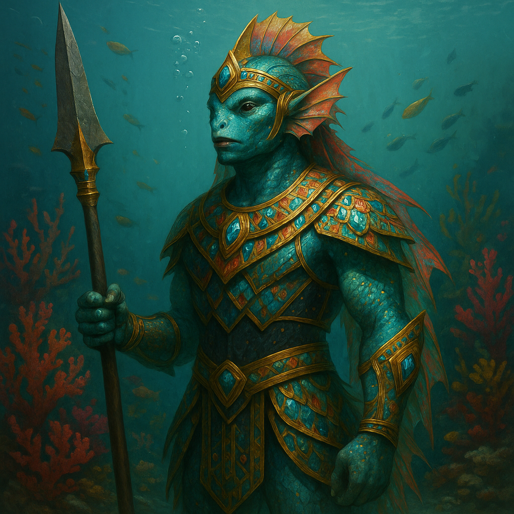 The Aquians are the tide’s oldest children, shaped of the brine itself, when the first waves licked Gaiatia’s stone and would not let go. They are a people who never needed to climb from the sea because the sea was already empire enough, their homeland of Naumos beneath The Laughing Sea, is a place of coral pyramids etched with glass hieroglyphs, reef obelisks crowned with moonlight, and basalt leviathans carved into eel, shark, and whale that stand eternal on the seabed. Their citadels glow with bioluminescence, their tombs are labyrinths that sing when currents pass, and their history is written not in parchment but in reefstone and glass tablets meant to last as long as the ocean itself. For the Aquians, time is not measured by kings, dynasties, or calendars, but by the patience of tides and the breath of trenches. They are a race both beautiful and haunting. Scaled in turquoise and jade, their skins ripple with patterns like shifting tides, their glossy black eyes reflecting the abyss, and their movements as deliberate as ritual. Every gesture is prayer, every silence covenant. They are artisans beyond measure, growing coral into palatial arches, pouring molten glass into prisms that bend light and magick, stringing jewelry from pearl and bone with as much care as a priest sets an altar. Their arms in war mirror their art, tridents, reef-forged sickle blades, helms wrought from conch and pearl, and scale-mail that glitters with glass and gold. On land these seem ornamental, but in water they become the most graceful of weapons. Their wealth lies deep, in pearl vaults and mineral veins pressed into trenches where no surface-born diver can endure. Their armies are the ocean itself, whales as siege beasts, jellyfish clouds as living mines, sharks and eels as vanguard. Even when the goddess Xaethra let loose her armies of Devils across the world of old that let loose The Great Schism at its end, Naumos only watched from the abyss. In modern times, Aquians have become inseparable from the distant islands of Tarmahc, woven into its ruin and its commerce alike. They dive where no Humans, Ursi, or Serpentine can, scouting drowned vaults and receding ridges for relics of its sunken former nations of Alandrior or Omendahl. They walk the broken ports as glass-jewelers, their trinkets luminous as fish scales, their songs drifting through night. They are sailors’ contradiction, the only people who cannot be enslaved, yet whispered to be sellers of slaves themselves. Shackles cannot bind what must breathe saltwater; even if taken in chains, the first glimpse of sea would see them vanish below forever. Yet tales abound of castaways who thought themselves rescued by a passing Aquian, only to be led ashore and sold to serpent-lords for as many gems as could be hung upon the Aquian’s throat. To surface folk, they are both saviors and betrayers, shimmering enigmas who drift between reverence and fear. Naumos endures even as Tarmahc lies shattered. The Aquians themselves say the ocean is older than every nation and will bury every crown. To endure is to obey the sea, and the sea does not take sides. It drags all things down eventually. In this truth, the Aquians have found eternity, and in their eternity, they have become both the most patient artisans and the most patient predators the world has ever known.