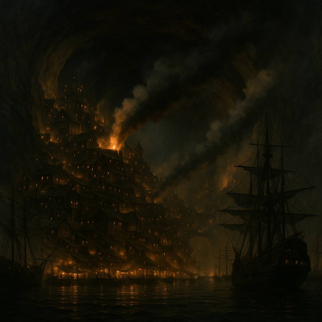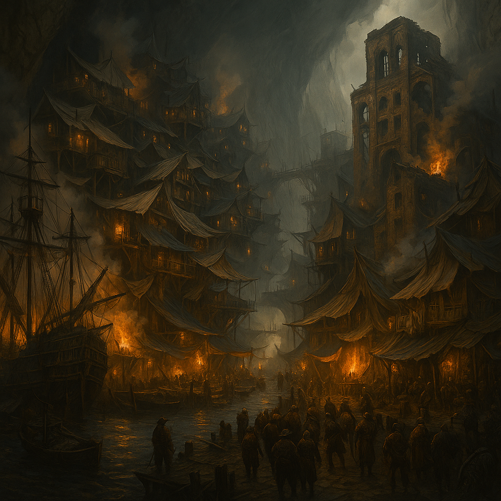The Bastion teems with life both temporary and entrenched, its heartbeat set to the pulse of tides and bloodshed. Its population swells like a storm tide during raiding season, when every dock is crammed with ships stacked two deep, and shrinks in leaner months, leaving only the die-hards, debtors, and drunkards. The Bastion draws those with no other harbor, fugitives fleeing justice, failed revolutionaries with burnt banners still in their hands, exiled nobles clinging to tatters of silk, and shipwreck survivors whose minds broke long before their hulls did. Here, bloodlines blur, children born in the Bastion grow up with saltwater in their veins, learning to climb rigging before they can read, their first lullabies the sound of waves against wood and steel striking steel. Strange minorities form in hidden corners: a small enclave of half-drowned, pale-skinned sea-wives said to worship something older than the tides; a knot of desert nomads who speak only among themselves and work the gunpowder kilns; and a dwindling group of monks-turned-brigands who keep a firelit shrine in a backwater alley to “the Last Watcher.”