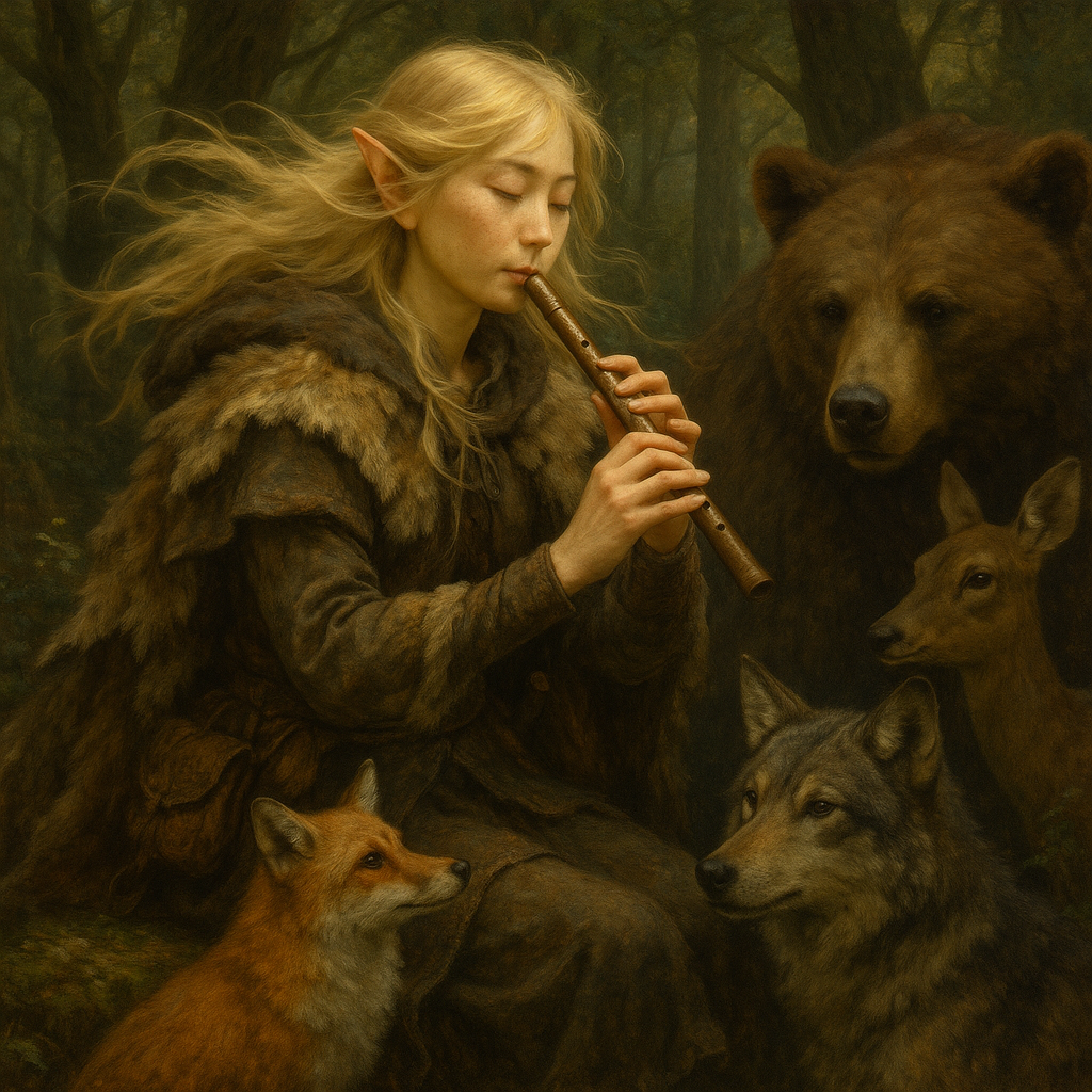 Her pale skin bears freckles scattered like pollen. Weathered hands tell her story more clearly than words, scratches from bramble, nicks from bone-knives, calluses from bowstring and climbing bark. Her blonde hair falls to her mid-back, often tangled with twigs or soft fur from her animal companions. She dresses in layered pelts stitched in functional patterns, each from a creature she respected deeply. Some were guides. Some were adversaries. All were honored.
