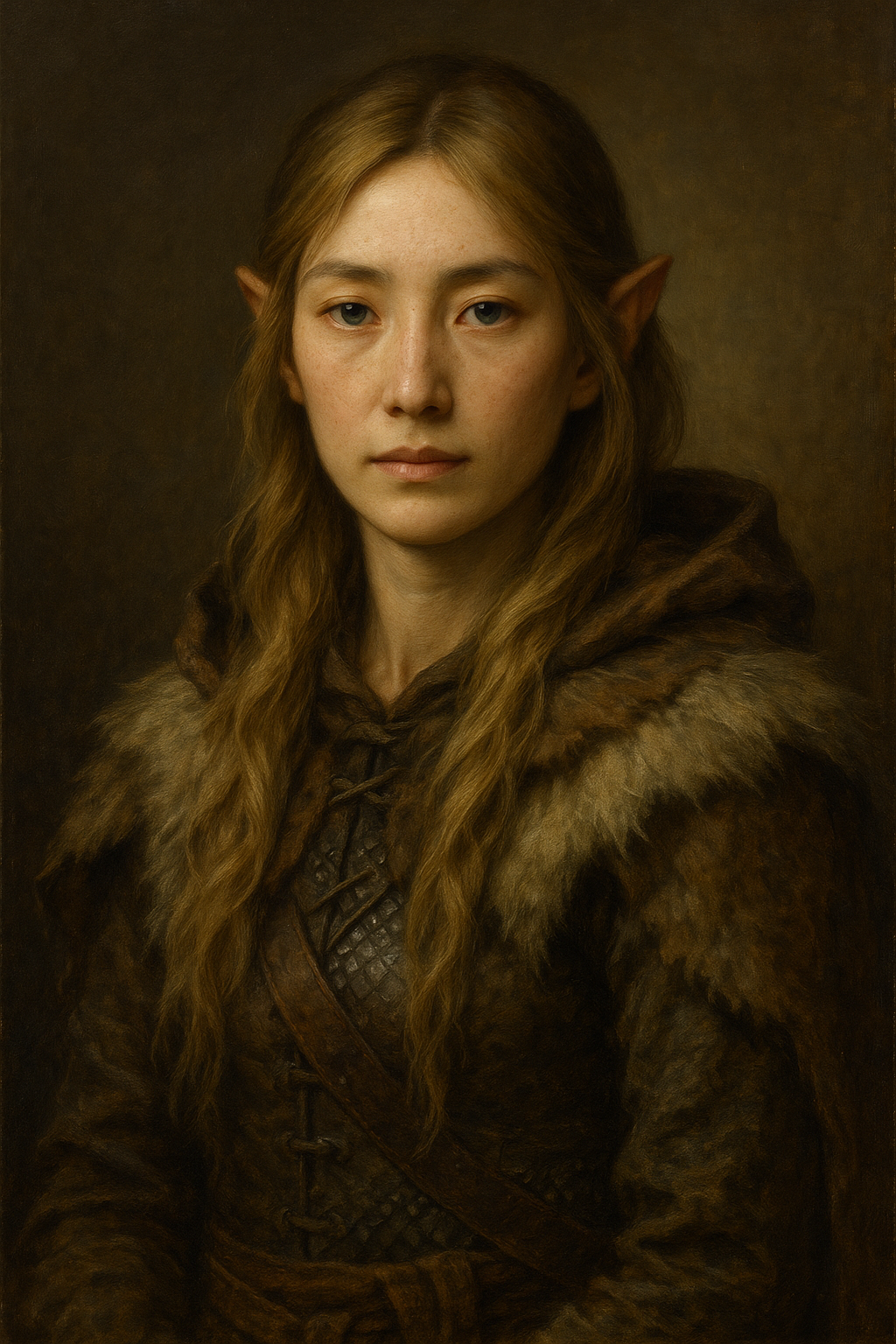 Her features echo Elfese elegance, sharper lines, high cheekbones, slight taper to her eyes, but softened by a human warmth and humbled by Everwealthy freckles. Her smile is faint but constant, the kind worn by people who survived more than anyone realizes. When she plays her flute, eyes closed, her face carries a serenity no city ever gave her.