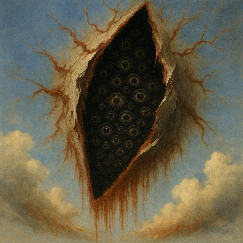 Caelbrith’s true form is not cloaked but torn open, a rift in the fabric of reality itself. Those who have witness him firsthand accidentally or otherwise describe him as a wound in the world, a gash across the sky through which light, sound, and thought bleed away into nothing. The edges of this wound quiver and split, forever breaking wider, yet never healing, jagged rents that gape into voids of absolute silence. Some survivors who gazed exceptionally deep swear that what lies inside the wound is worse still, glimpses of thousands of eyes in all directions yet al locked onto you wherever you go; Even after Caelbrith's form is long gone. Others speak of vast, ringed fractures, concentric halos of shattering crystal, that rotate and collapse upon themselves, erasing memory with every turn. To look upon him is to feel thought itself stutter and fail: words cut mid-sentence, memories collapse into blankness, entire languages abandoned in the space of a breath. Those who survived Caelbrith’s manifestation describe not merely horror but erasure. One soldier returned from his vision unable to finish any spoken word; another wept constantly, unable to recall why; still another stood frozen for weeks, his face locked in an unfinished scream. His form is not endured, it is survived, if one is not reduced to silence or unbeing altogether. When Caelbrith cloaks his essence for communion, it is no less unsettling. In dreams, he appears as a fissure running through sky or soil, bleeding black light that drowns sound. In waking avatars, he manifests as executioners without mouths, pallbearers whose faces are scarred with cracks, or statues that fracture when seen too long before repairing themselves in silence. Wherever he walks, time feels interrupted, as though the world itself forgot what it was doing. His presence is not weight like Orram, nor turning like Ny’yala, it is rupture. A divine subtraction. A wound that cannot heal.