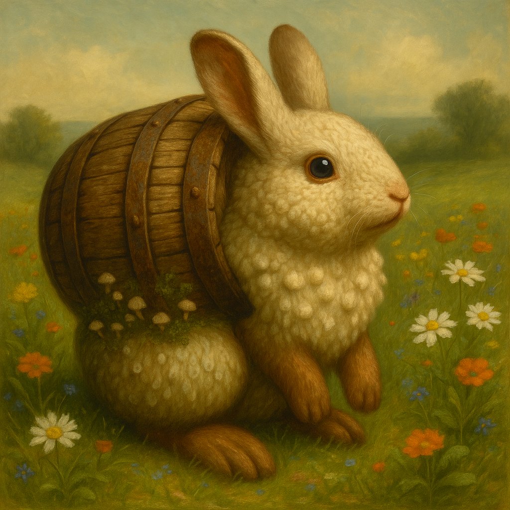 The Caskrabbit is a curious, fungal, shell-wearing creature native to the Boulderrain Woods and overgrown trade routes of Everwealth. Believed to have emerged sometime after The Great Schism, it blends the shapes of prey and container, beast and vessel. This rotund, woodland-dwelling animal resembles a cross between a puffed hare and a mushroom. Where most creatures evolved to flee or fight, the Caskrabbit camouflages as forgotten cargo it wears on it's back for protection of it's soft hide, biding its time before releasing a choking burst of soporific spores and fleeing in a rolling lurch. Though rarely dangerous on its own, the Caskrabbit’s effects on memory, clarity, and breath have made it both feared and sought after. It is especially common in The Woodswatch Mountains and Boulderrain Woods regions, the stone-buried clearings near Landsbridge, and certain moss-choked ruins where carts and crates lie rotting. The Caskrabbit is among the more bizarrely constituted creatures in Everwealth. Its lower half is composed of mold-flesh, a soft, fungal underbody from which clusters of small white mushrooms often sprout. This sensitive portion is prone to damage and desiccation, leading to the Caskrabbit’s most iconic behavior: its hermit-crab-like compulsion to encase itself in discarded barrels, hollow bones, or broken wine casks, which it wears like armor over its vulnerable fungal underside. From behind, it appears as a rotund, sealed keg, and only the twitching ears or nervous shuffles give it away. This hybrid nature makes the Caskrabbit highly attuned to fungal rhythms and decay-rich ecosystems. Though odd, it behaves very much like a rabbit, skittish, alert, and compulsively foraging, albeit one that disappears in a puff of dream-spores and laughter if you reach for it too quickly.