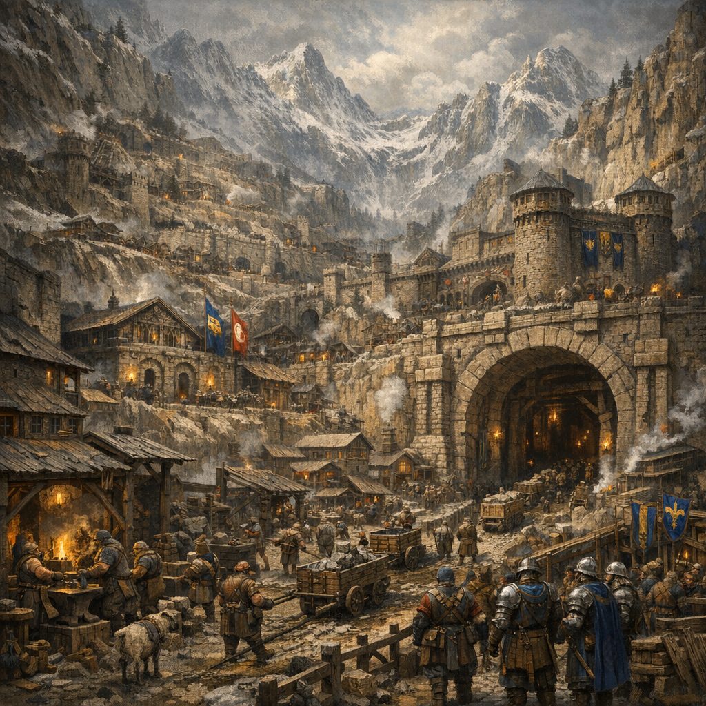 Dwarfshire is built to endure. Unlike the wooden structures of lesser mining camps, its buildings are carved directly from the stone of the mountain, designed to withstand both brutal winters and the tremors of excavation. The town is divided into sectors, each serving distinct purposes, mining camps, worker barracks, supply depots, and military fortifications. The tunnels themselves are supported by grand stone pillars, reinforced with Republican ingenuity and Everwealthy adaptability, ensuring they do not collapse under their own weight. The town’s roads are well-maintained, as constant shipments of ore and stone require sturdy pathways. Bridges and reinforced causeways allow carts to move freely, ensuring that excavated material reaches trade hubs with minimal delay. While Dwarfshire lacks the elegance of Everwealth’s great cities, its raw, unyielding stonework speaks of determination, function, and an unrelenting march toward its goal.