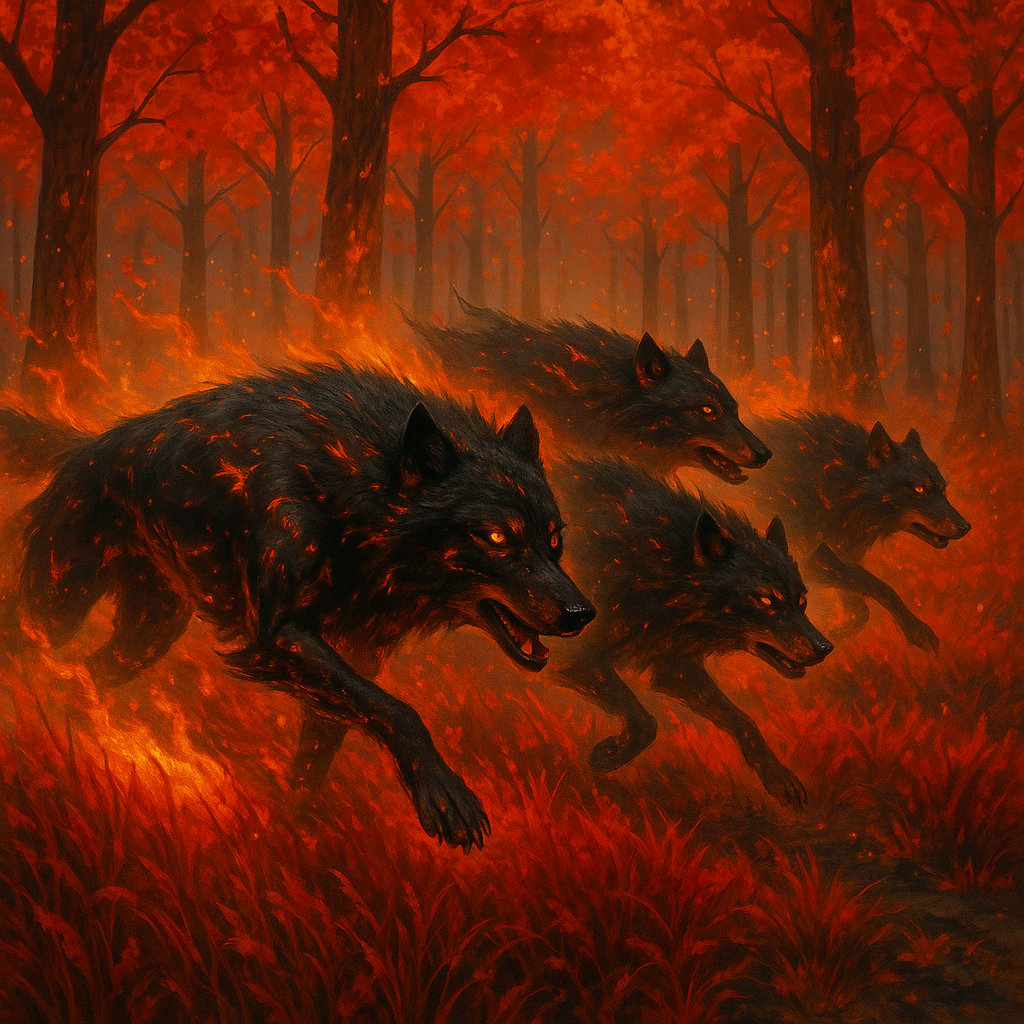 To the weary who wander The Ashwood, the ember wolf is less an animal and more an omen written in smoke and shadow. Cloaked in soot-black fur streaked with a dull, smoldering red, these spectral predators drift through the petrified trees like memories of some ancient firestorm. They do not stalk by sound or scent alone, but by heat, drawn to the smallest flicker of flame as a starving man is drawn to bread. The foolish light their campfires thinking it will ward off what prowls the night. The wise know better. For ember wolves feed on fire as much as flesh, lapping up warmth from dying embers and leeching the last heat from the air until even the bravest shiver. Their arrival is not heralded by a howl, but by the way flames gutter low and die for no reason at all. By the time a traveler notices, the glow in the wolf’s fur is already there at the treeline, pulsing like the breath of a coal about to flare. Stories claim they are born of the Ashwood’s curse, wolves caught in the ancient blaze that petrified the forest, yet refused to die. Others say they are not beasts at all, but the restless shades of hunters who perished in that fire, their bodies remade in smoke and ember to haunt the living. Whatever the truth, the sight of their eyes, obsidian mirrors catching the reflection of your own burning death, is enough to still the hand of even a seasoned sellsword. They do not rush their prey. They wait. They walk in pairs or trios, circling at the edge of sight until fear does the killing for them. Then, when the fire’s gone out and the warmth has fled the body, they feed, not just on meat, but on the blackened wood, the ash, and whatever dying heat remains. By dawn, there is nothing left but cold bones in the frost and a faint smell of smoke, fading on the wind. In the Ashwood, men whisper that fire is both your only friend and your greatest betrayal. For the ember wolves are patient, and they know that sooner or later, every flame burns out.Basic Information