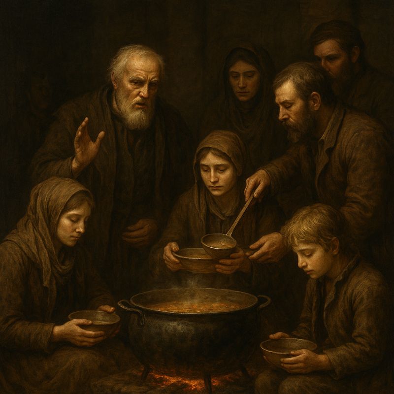 Folkshare’s origins reach into the earliest, bleakest winters of the Civil Age, when famine devoured half the fledgling kingdom and survivors survived through barter, grave-robbing, or sheer stubbornness. Grain stores were ashes. Fields lay salted. Entire villages starved with their gates still shut. Then came the First Feast, a gathering of thirteen starving families from three broken settlements. They brought what scraps remained, a handful of potatoes, a stringy rabbit, bitter cabbage, stale barley, handfuls of frostbitten carrots. It should not have been enough. Yet when the meal was stirred together over a single fire, it fed them all. Word spread. Hope flickered. Refugees from surrounding ruins followed the smoke. By the Feast’s end, over a hundred people ate from the same pot, bound by the unspoken oath that survival must be shared or it would not exist at all. In the decades that followed, Folkshare transformed into a kingdom-wide holiday, a ritual of remembrance, gratitude, and quiet fear. Villagers believed that failing to honor the Feast meant forgetting the Schism’s lessons, and forgetting would bring the suffering back.