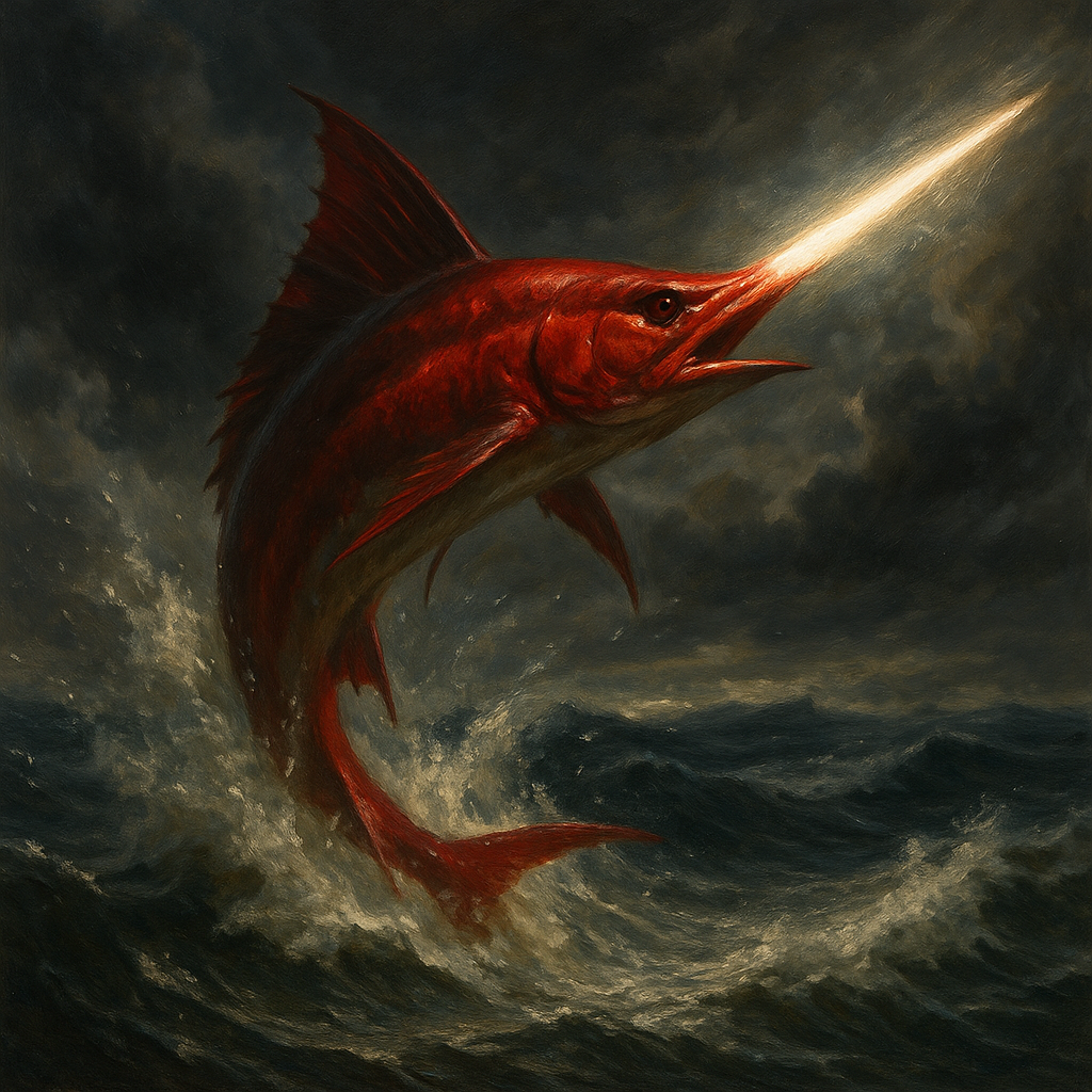 The Glintspear cuts the tide like a streak of sunset blood, its horn burning white as if lit by a storm yet to arrive. Hailing from the myth-thick waters of The Laughing Sea, this deep-sea predator is no mere fish, it is a blade given breath, a duelist dressed in polished crimson and shadow, gliding through the dark with violent pride. Its body glows with danger: a shiny blood-red frame. Its horn, a long, ivory-lit lance of keratin, does not just shine, it screams with arcane light, said to be a beacon to storm gods and a curse on reckless sailors. They say it pierces prey or hulls mid-leap, not out of hunger, but to answer a challenge, as if the Glintspear recognizes boats not as threats, but as opponents in some ancient test. To catch one is to gamble with madness, to risk everything for a tale that will be whispered in taverns and carved into dockside posts. The Glintspear does not swim near boats. It stalks them. Some say it dreams of tempests. Others swear it brings them in its wake. Whatever the truth, when the waves redden with shimmer, when the seas still and shadows ripple, there is no doubt: a Glintspear is watching. And if you’re lucky, it will strike.Basic Information