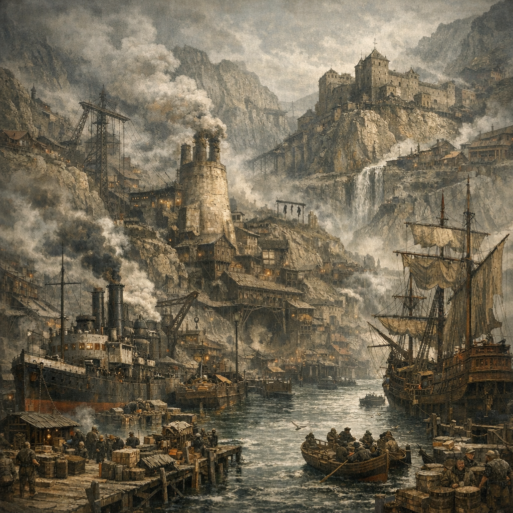Greatshadow is a city that works, violently, inefficiently, and at the end of a blade. Carved into The Stonejaw Mountains and anchored to the treacherous waters of Lough Shears bordering southern nation of Kathar; It stands as one of Everwealth’s most vital industrial hubs, and one of its most dangerous places to live. Stone, iron, lime, and ships flow out of its gates every day, even as bodies pile up in its alleys by night. This is a city where law exists, but only as another commodity. Mining barons, dockmasters, mercenary captains, and smugglers all operate beneath the same banners, their rivalries kept in check not by justice, but by profit margins and fear of disrupting production. The lough is watched, the quarries are guarded, and the ancient screeching factories never stop, but between those points, crime flourishes in the gaps no authority dares fully close. Greatshadow offers fortune to those willing to take it, power to those who can hold it, and death to those who misjudge either. Every contract signed here is written with an invisible clause, someone else wants what you’re standing on. Dig too deep, move too much cargo, or pull the wrong lever, and the city will remind you what it costs to matter. It is a land exploited. And it will pay you well, you can exploit it too, right up until it kills you.