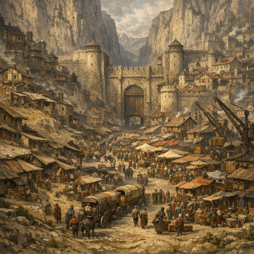 Halt-Cliff’s lifeblood is its Cliff-Wall, the great barricade that seals the only breach in the Battlement Cliffs. More than a fortification, it doubles as customs hall, barracks, and city gate, the first and last sight for any traveler entering Everwealth by sea. Beneath it, caravans and pilgrims shuffle through narrow checkpoints where tariffs are exacted with unyielding precision. The city has been reshaped in recent years by the return of stone-crane technology, revived by The Scholar's Guild. These towering machines creak endlessly above the yards, hauling crates from barges and swinging them to the warehouses carved into the cliff face. With them, Halt-Cliff has leapt from backwater stronghold to industrial hub, able to move goods in hours that once took days. Within the walls, paved streets and aqueducts keep the wealthy districts orderly, while the slums sprawl in mud and makeshift planks, lit by nothing but tallow candles and guttering lanterns. Though uneven and often harsh, Halt-Cliff’s infrastructure is relentless. Every crane that turns and every plank nailed to a sagging roof testifies to the same stubborn will: the city will not fall so long as its cliffs stand.