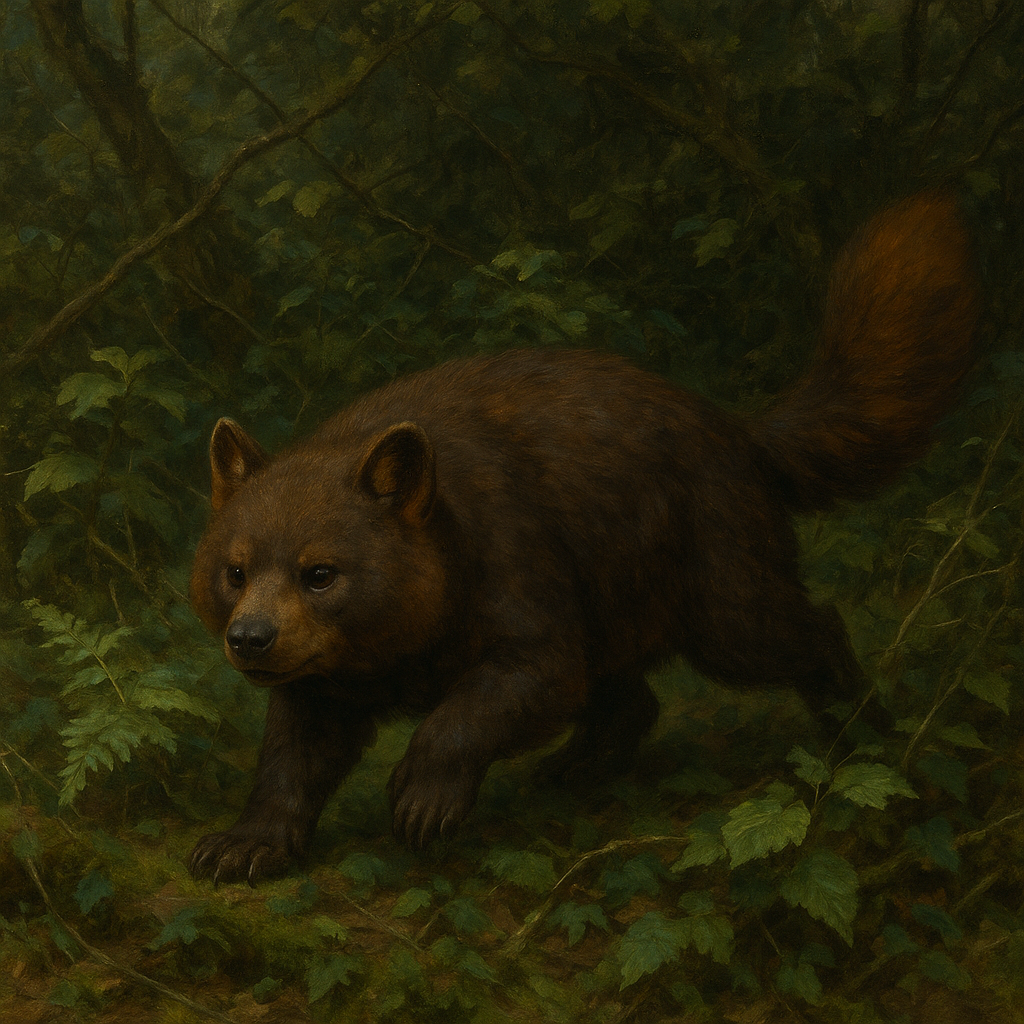 The Hedgehunter is stocky and low-slung, measuring roughly two feet long from snout to tail-tip, with a thick, muscular frame that belies its dexterity. Its fur is dense, warm-brown to bark-black, with seasonal variation, often lightening to russet tones in autumn and darkening before frost. Thick, curved claws mark its paws, built more for climbing and burrowing than slashing. The head is distinctly bear-like, but narrower in the muzzle, with forward-facing eyes shaded by a slight brow ridge. Crescent ears, upright and expressive ending in a subtle triangular tip, rise above its rounded skull, often twitching at the slightest sound. The tail, trailing long behind it, provides balance and warmth in equal measure. Some woodfolk compare it to red-furred, ring-tailed creatures allegedly once found here, but now found far to the eastern lands of Kibonoji, seemingly leaving Everwealth in exile with the Elfese; But only in passing, compared to these 'Red Pandas' the Hedgehunter is hardier, sharper, hungrier.
