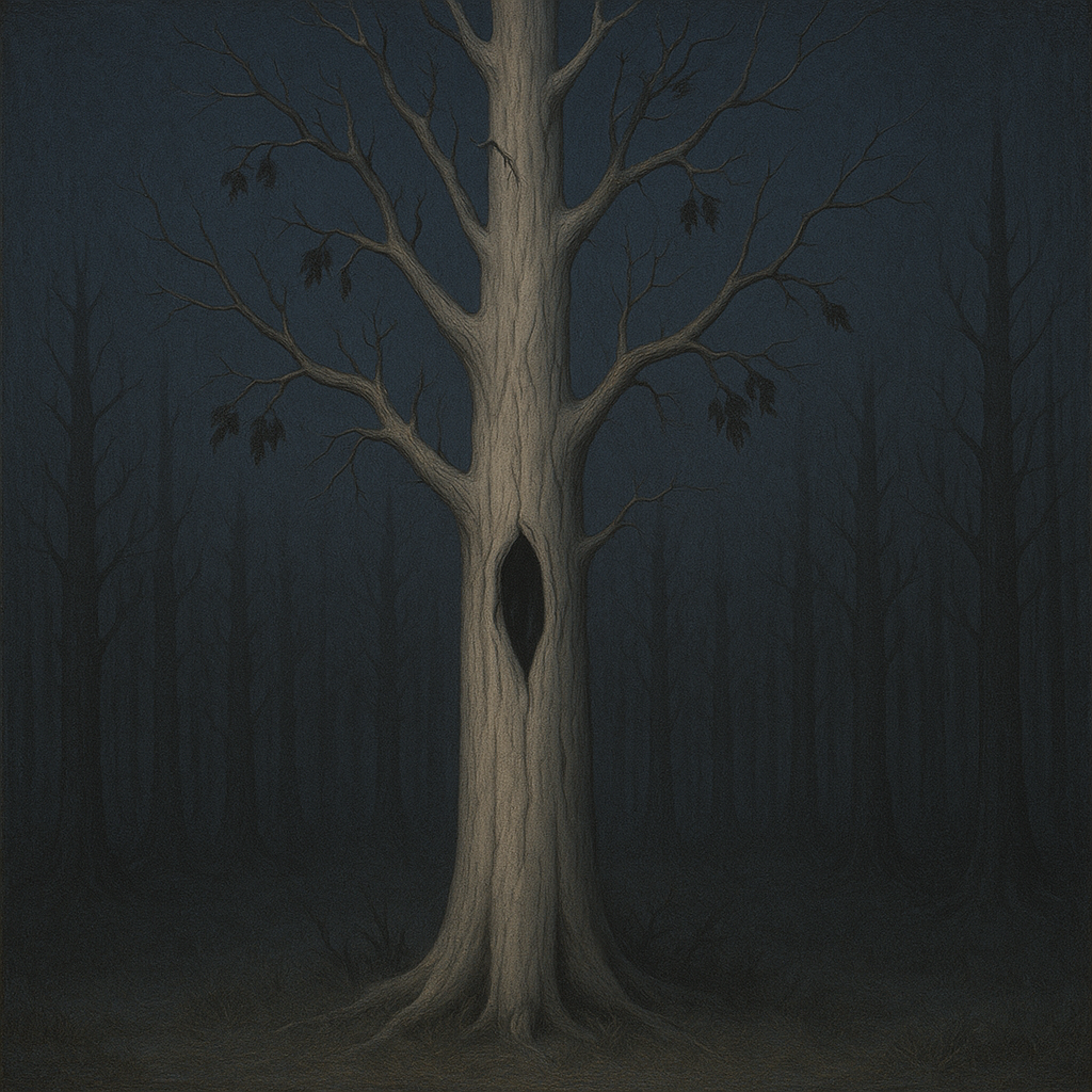 A pale, towering tree, its bark smooth as bone, its branches clawing at the sky. Unlike other trees, it does not bear rings, it is ageless. Its leaves, black and brittle, crumble at the slightest touch but regrow within moments, whispering softly as they reform, though no wind stirs them. Some claim to have seen words faintly carved into its bark, written in languages long dead. Yet, when they return to prove it, the markings are gone, and so is the memory of ever having seen them. There is nothing inside the Hollowhusk. No core, no heartwood. Just emptiness. Those who have cut into its bark find that the inner wood is a perfect, bottomless black, absorbing all light. If a piece is taken, it withers to dust within hours, and its former owner forgets ever having held it.