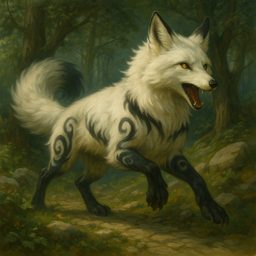The Inkfox stands roughly 15 hands tall at the shoulder, its frame lean and sinuous, more lupine than vulpine, built for both forest sprints and silent, patient travel over great distances. Its limbs are long and muscled, ending in ink-dark claws that seem to smudge the very earth they touch. The creature’s fur is a dazzling gradient of whites and pale grays, like snowfall caught in twilight, but from the thick tufts around its legs swirl curling patterns of pure black, like ink trailing through water. Its long, expressive face carries an otherworldly grace, crowned with sharply pointed ears that twitch at the faintest tremble of leaves. Its eyes shine like silvered mirrors, reflecting light and movement with uncanny precision, always watching, always waiting.