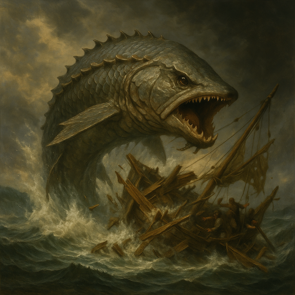 A monstrous wraith of Everwealth’s drowned heartlands, the Ironjaw is a relic of older waters and older wars, a siege weapon grown gills, forged from scales and scars. Towering over all other freshwater predators, this seabound leviathan bears the broad, bladed mass of a sturgeon, wrapped in scale-plate armor knotted like rusted chainmail. Its movements, however, speak of a darker inheritance, the unpredictable speed of a bull shark, sudden and crushing, driven by violence more than hunger. Despite its mass, it glides through the water like a pulled thread, precise, silent, irreversible. Some claim no creature escapes an Ironjaw’s pursuit, and no sailor forgets the scream of splintered hull as it breaches below. Found in the trench-pits of Lough Shears, Lough Lord, and Lough Icewind, it is feared, bargained with, even worshipped, a beast made myth not by absence, but return. Fishermen mark their boats with its likeness to keep it away; priests offer rites to the drowned in hopes their spirits appease its rage. The Ironjaw is more than a predator. It is a legacy of valor drowned, judgment deep-slung, and hunger that waits beneath.Basic Information