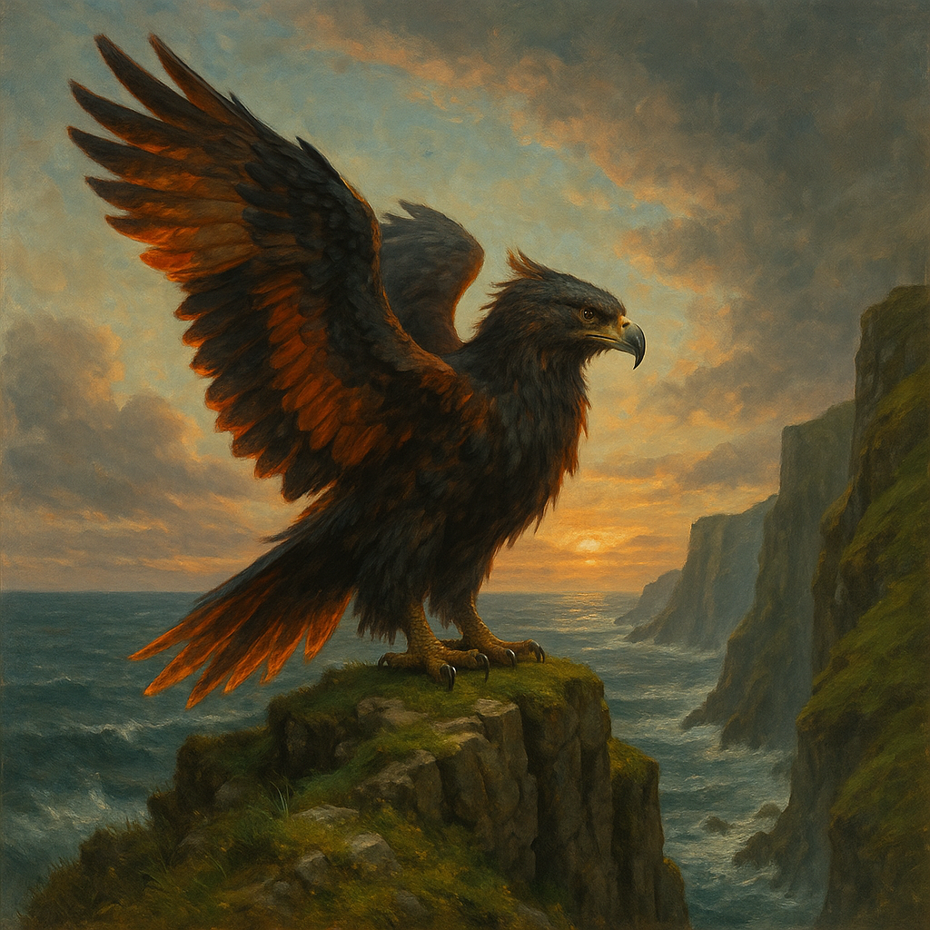 A full-grown Lanternwing stands as tall as a warhorse, its wings stretching twenty-two feet from tip to tip. At a distance, it looks like sunset incarnate; Up close, it is all knives and sinew. Its plumage is oil-dark until the light strikes, then blooms into violent color, amber bleeding into crimson, crimson into smoke. The beak, hooked like a scythe and ridged like forged steel, can split armor from neck to navel. Its talons, long as daggers and twice as sharp, have been known to lift a stag from the ground or tear a man in half mid-flight. Despite its monstrous size, the Lanternwing eats rarely. Scholars from the Guild of Beasts suspect a magickal metabolism, a furnace within its flesh that burns thought or memory as much as meat. But when it hungers, the sky itself becomes unsafe.