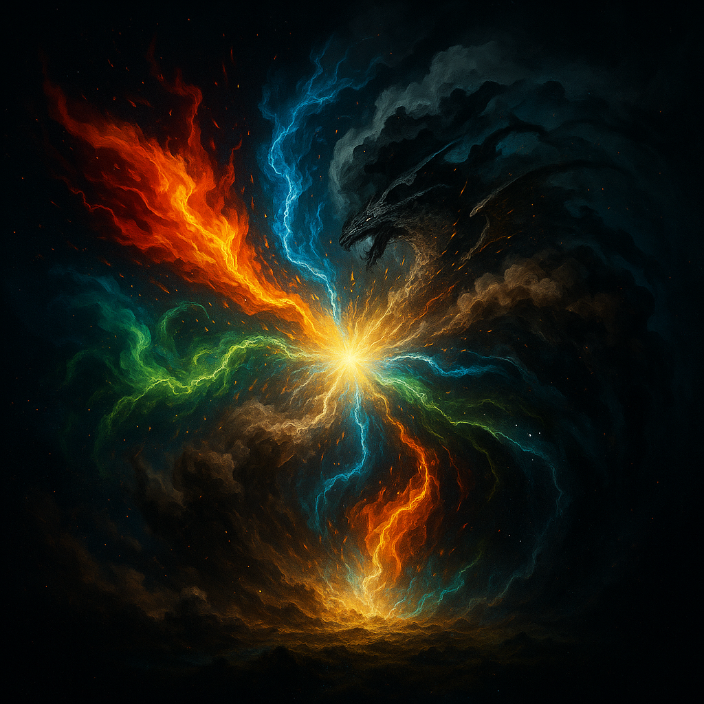 Aether is not matter, not flame, nor air, nor stone, it is the shimmer in-between, the ripple of the world’s skin where the Arcane presses through. It is not mere substance, but the breath that allows substance to act. Aether does not rest and does not bargain; it amplifies any element it touches, tenfold, though at the cost of stability. In relics, it remembers, weapons sing with spells they once drank, robes twitch with half-forgotten wards, and old ink enforces oaths long after the signer is dust. To touch it raw is to burn the soul. Mishandling it births paradoxes: backward storms, frozen thunder, vanished hours, or creatures that should not have been. If the other elements are words, Aether is the ink. Indifferent, implacable, it does not speak, it defines. Fire: