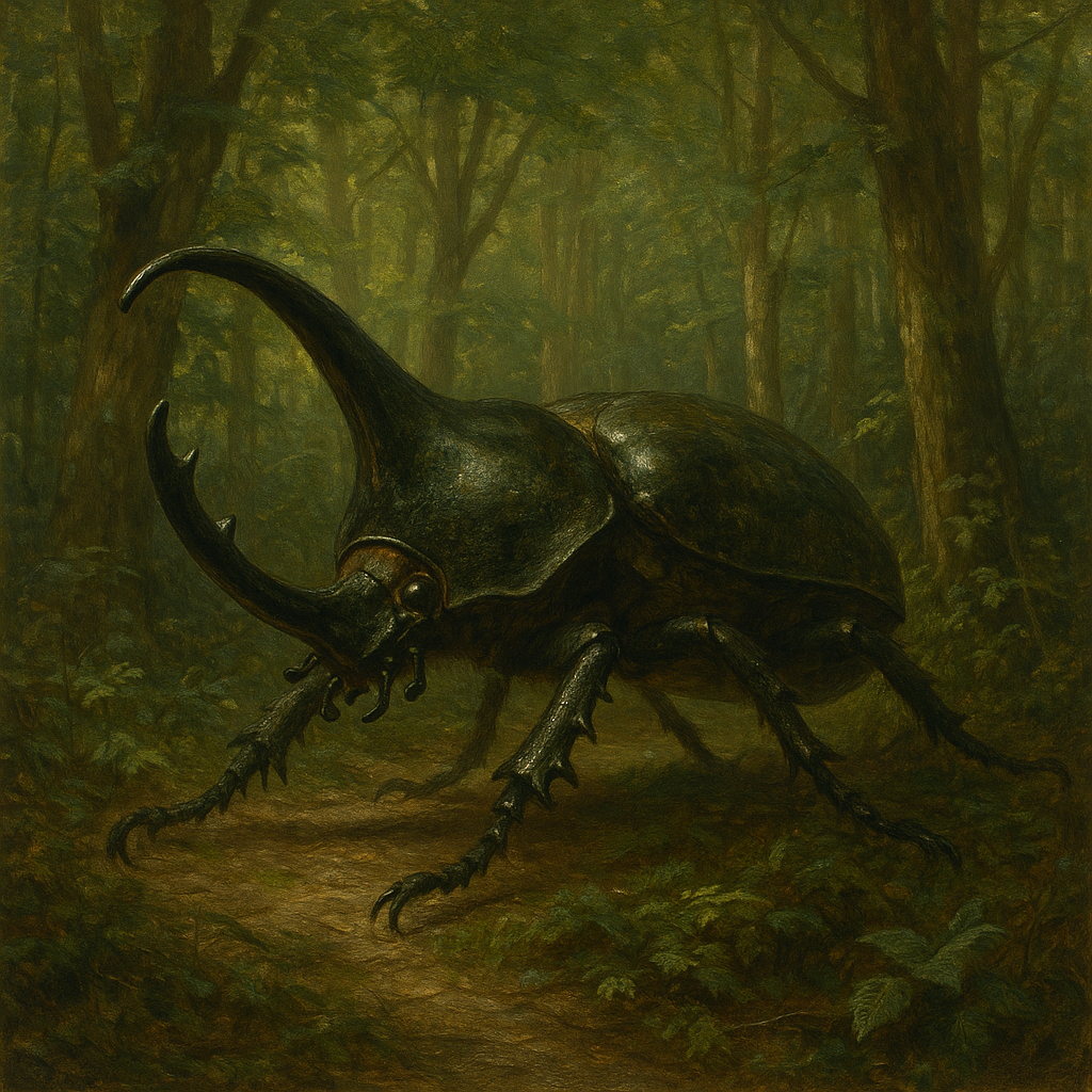 Manhunter beetles are deadly, horse-sized predators who haunt the reaches of The Grandgleam Forest; Jagged, sandpaper-like carapaces, barbed, poison-coated horns capable of paralyzing their prey within moments, a woesome threat to be sure. Found in the Grandgleam's dense regions and magick-rich environments like along Green-Thumb River, these areas should be tread with caution in-no-small-part because of the manhunter; Their species uses a chameleon-like camouflage coupled with a 35 mph flight speed to ambush prey ranging from deer to unsuspecting villagers, their appetites care little for the difference. Highly social during mating seasons, these beetles form swarms numbering in the hundreds, leaving trails of devastation across settlements they plague. Resistant to conventional weapons and thriving in hostile conditions, manhunter beetles are a persistent threat that showcases nature’s most horrifying extremes.