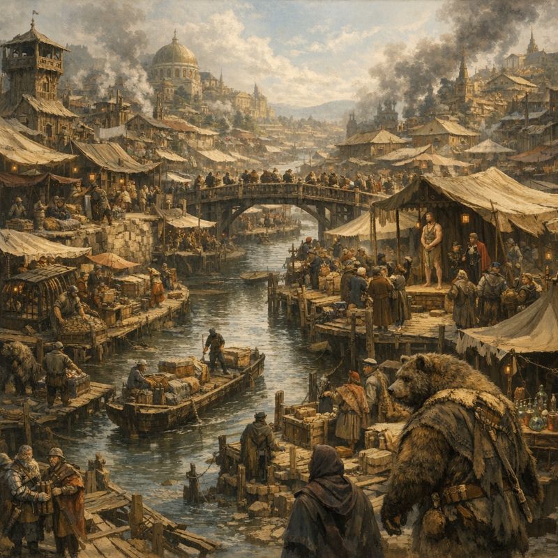 The Meet is a city built on its own bones, layer upon layer of markets, caravans, and wagons turned to permanent homes. Cobblestones meet wagon planks, bridges groan with rot, and river-docks lean under the weight of goods. The Merchant’s Meet Flood forced the construction of docks and ferries, transforming the city into both a caravan stop and a riverport. Yet it lacks sophistication. No aqueducts, no sewers, only ditches and rain collectors. Streets flood with every storm, and half the alleys stink of rot. But no one cares, so long as the markets never close.