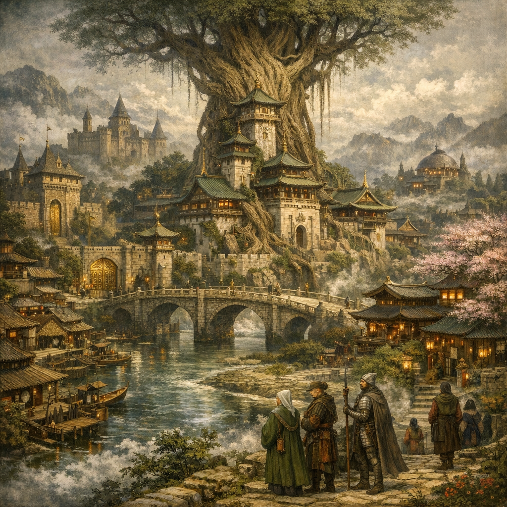 Middleglade is a dream that refused to die. Once the radiant heart of the Elfese Empire that ruled these lands in ancient days; Centuries after their empire's collapse, it endures as both crown and scar, a city of marble bones and living roots, where beauty masks the rot beneath. Wrapped in the coil of the Green-Thumb River like a serpent guarding its own reflection, Middleglade gleams through its perpetual mist as though lit from within by ghosts. Old pagodas dance with new thatched roofs in miles of lantern-lit roads. Its bridges glisten with the polish of ten-thousand years of footsteps. To the Everwealthy, the city is triumph, taken as a trophy, proof of their victory of this place's former masters. To the Elfs who still dwell there, it is a grave they must tend forever, forced to live among the ruins of their own perfection. The air carries a strange sweetness, the scent of flowers growing from battlefields, of incense masking decay. At dawn, the light strikes the city just so, and for a moment it looks alive again, until the mist moves, and one remembers that Middleglade is not living, but trudging along. At the heart of the city stands the Motherbark Tree, vast and unknowable, a living monument older than civilization itself. Its roots worm through every foundation, its pulse felt beneath every cobblestone, binding the city in something between blessing and bondage. Local Druids, a group known as Nature’s Chosen, claim to commune with it, to hear the tree’s slow, deliberate thoughts whispering through the wood. Warnings of famine, war, and worse. Everwealthy rulers show little respect, but they do listen. They remember the Massacre of 91 CA, when a thousand beasts marched from The Grandgleam Forest surrounding the city and erased an entire regiment overnight when they ignored the druid's warnings for them not to enter the woods. Some whisper the tree grows restless, that its roots are shifting, cracking stone, widening tunnels, reaching deeper into the veins of the city as though searching for something it lost. Those who live closest to it claim to hear breathing beneath the streets at night. Few sleep well in Middleglade, and fewer still dream, for the city dreams enough for all of them.