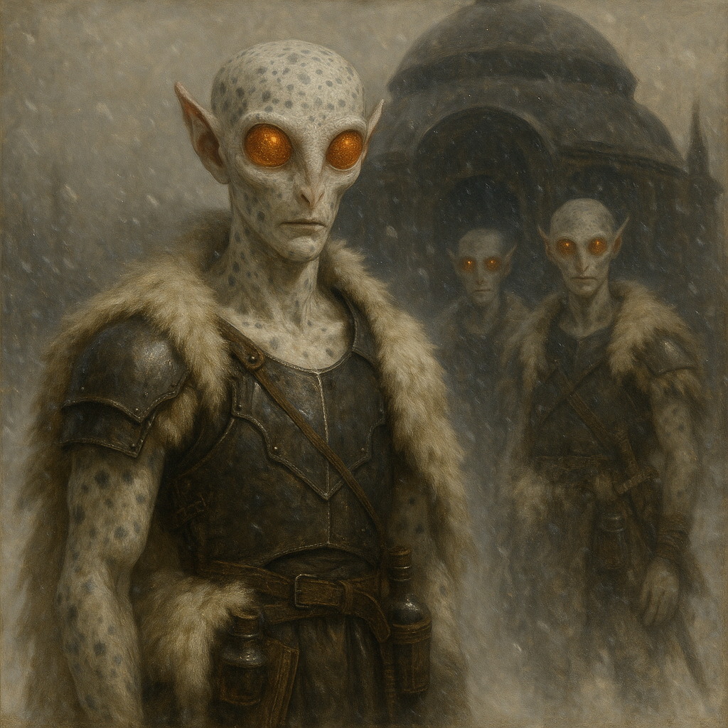 Though adaptive to any environment, they cling to the frozen tundras of Arcryo, as if the silence and cold echo their true home. Their “heritage” is less blood than story, passed down through Circles of Archivists who inscribe memory into glass. Yet their stories shift with each retelling; the past erodes, reforms, contradicts. They have no kings or queens, only Vectors who guide silence through storm, Warders who guard the halls, and Archivists who reconcile fractured memory into something resembling truth. To outsiders, they seem disciplined; to themselves, they are fragments searching for a whole that may not exist. The Moon-Kin first appeared in the late Schism, stepping from the black temple-ship in the frozen crater of Arcryo. No one knows if they arrived by accident, exile, or pursuit, whether they were marooned by a consequence of the Schism, or fled a world now lost. Their earliest accounts are fractured, etched on glass-leaves that contradict one another. Some speak of riding “carriages of light” that crossed skies in an instant. Others describe rifles of fire and halls that bent gravity itself. Whatever truth once existed is long since warped by retelling. The first Everwealthy explorers to encounter them described them as “ghosts of the moon,” tall, pallid figures moving without sound. Fear spread quickly, but so did fascination. Their home, half-buried, thrumming with runes no scholar could decipher leaves many drawn to them out of curiosity alone;And the Moon-Kin are hospitable to what few are capable of making the journey through the frozen wastes to satisfy their curiosity. But this is a rare circumstance to be sure. Yet the Moon-Kin endure, idling away confused but content within their little corner of the world. Adapting to thei ice and snow as if the blizzards were a comfort, not a threat. At the centuries passed since their arrival, they became less rumor and more myth; Some not believing they even exist. Extremely rarely seen beyond Arcryo, trickling into Everwealth’s ports only when necessity demanded trade, glass veils for rare arctic pelts, storm-charts for whale oil. Their pyrrhium rods became objects of obsession. The Elfs of Kibonoji claim them as somehow stolen relics, their people holding a strict monopoly otherwise; The Scholar's Guild calls them proof of otherworldly technologies. But the Moon-Kin themselves offer little more than shrugs as their only input on the truth of the matter. Today, scarcely a few thousand remain, scattered across the crater halls. They are as rare as the Avian, but far less trusted. Outsiders see them as eerie, unblinking, and invasive, creatures with no concept of personal space or how we understand typical interaction, speaking in monotone cadences while pointing their long fingers into one’s face to address them. Some whisper they are not mortals at all but remnants of a forgotten war beyond the sky, stranded in a land that was never theirs. If this is true, then the Moon-Kin are not merely refugees of the Schism, but the last emissaries of a catastrophe yet to come.