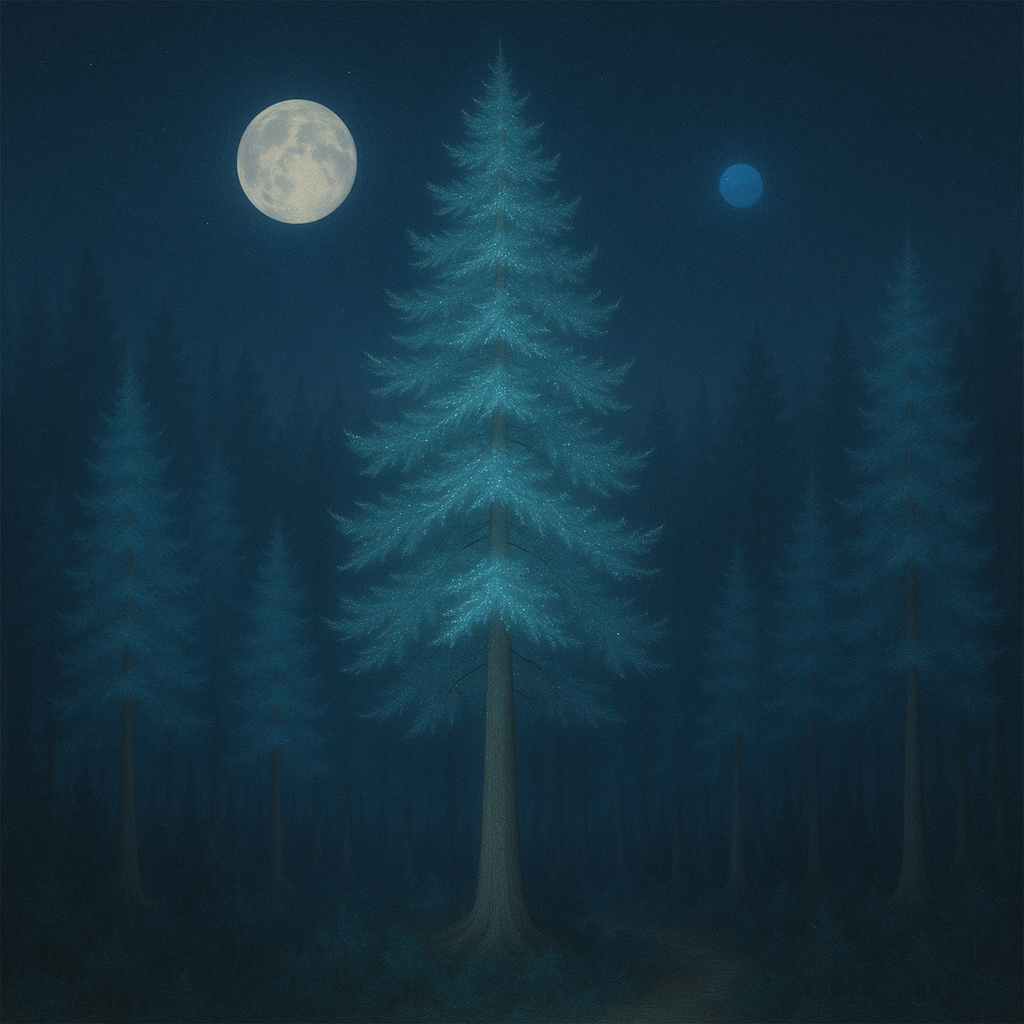 The Moonpine is a majestic conifer, with a tall, slender trunk and branches that stretch high into the sky. Its bark is smooth and pale, shimmering with an otherworldly, milky glow. The needles of the tree, unlike most pines, are long and delicate, growing in clusters of soft, silver-blue strands that seem to shimmer in the moonlight. When disturbed, the tree releases a faint, almost musical hum, as though the wind is gently singing through the branches. The most fascinating feature of the Moonpine, however, is its bioluminescence. At night, the tree lights up with a soft, ethereal glow, the pale light appearing to come from within the tree itself rather than merely being reflected.