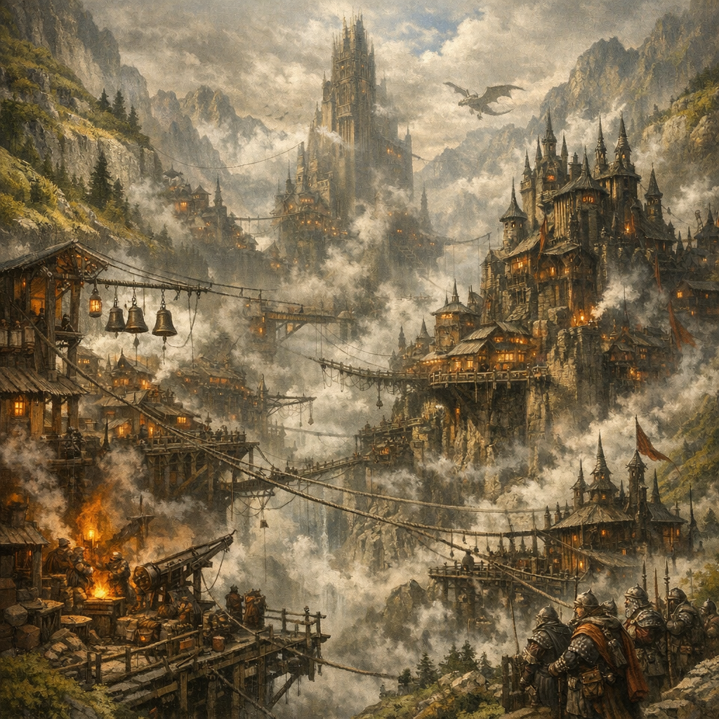 Newspire rises over The Cloudrend Mountains' like a deafening hymn. A city of towers and timber, rope-bridges and roaring fires strung across jagged cliffs like a web spun by a spider of mythic proportions. It is a place that hums, not softly, but in the deep, bone-felt rhythm of iron striking iron and boots upon hollow wood. When the fog rolls low, the whole city seems to float above an abyss, its lanterns and forges glowing through the mist like the beating heart of something old and defiant, the buildings of the lowlands clawing upward from the veil of smoke like they want to drag the upper rungs down with them. To outsiders, it looks precarious, a miracle of architecture that has no right to stand. To the Dwarfish it is proof that beauty can still be built in a world that keeps trying to bury it. But beneath the songs and smoke lies exhaustion. The forges never cool, the ropes never rest, and every laugh carries the echo of an old sorrow. The capital of the Dwarf's Ironclad Republic, a sovereign nation granted to them by men at the end of The Great Schism for their aid in defeating the ancient Elfese who ruled this place; A conflict that nearly destroyed the Dwarfs. Their plight and perseverance through it have granted it a name polished enough to disguise how much of it is held together by labor, blind faith, and stubborn pride in old agreements. Between the singing taverns and the roaring markets, the scent of hot steel mixes with pine tar and sweat, one can almost forget that this city was born from loss. Almost. The higher towers glitter with banners and ale, while the lower decks drown in shadow and soot, where the bridge cables drip with condensation and the workers sing low to keep their courage steady. Newspire is rich in many thinghs, history, unity, but it is no paradise; It is perseverance, hammered into form, daring the world to try and break the Dwarfs again.