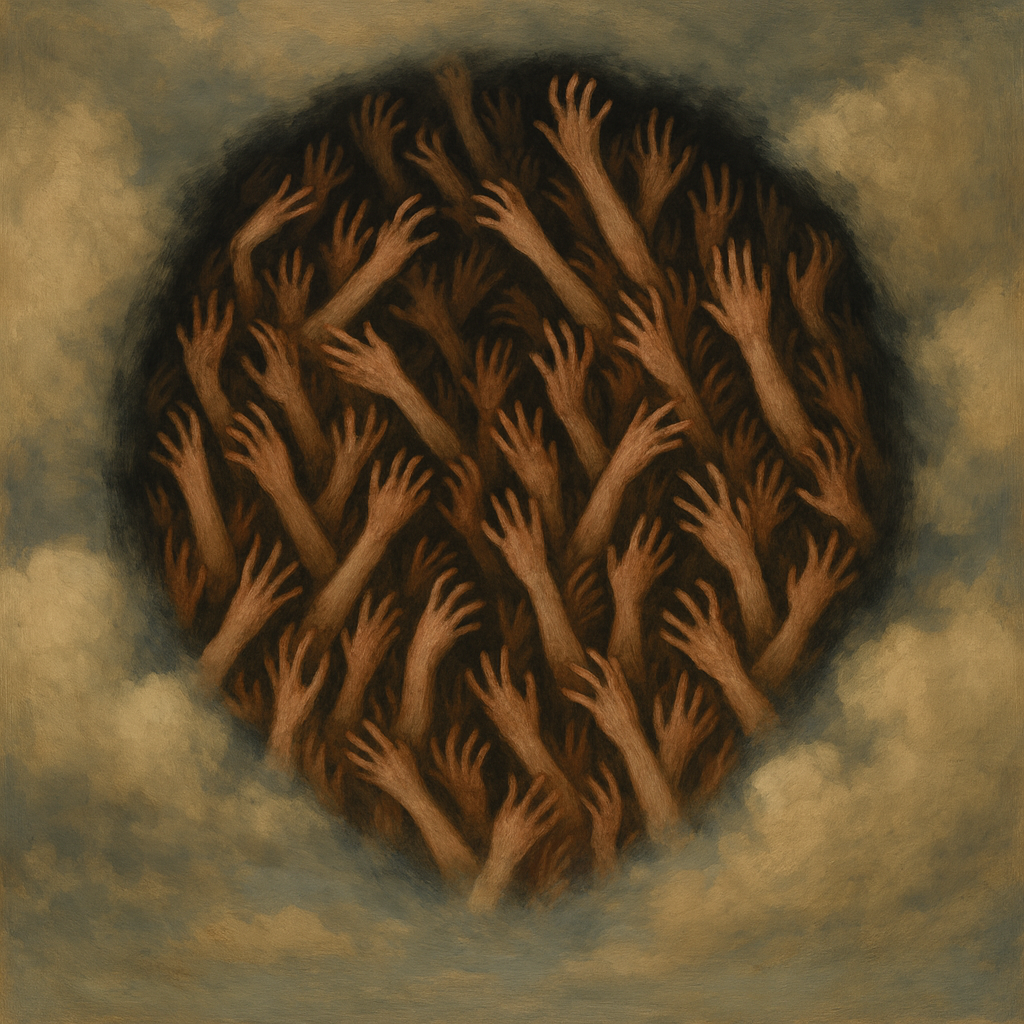 Orram’s truest manifestation, to mortals who have glimpsed him, and survived long enough to speak, exists as a a formless void that devours all light around it. Orram is the only god fabled to have attempted to appear in The Folklands physically, and how we both know of today of the terrible dangers such an action brings; Legends tell of one day in the earliest years of The Origin Age, long before we knew his name, that the clouds parted into a pit of emptiness that pulled at the eyes and lungs alike. Within that void drifted translucent, half-visible arms, grasping and clawing at one another, each dragging the next deeper into the collapsing dark in any way it could. A sight at once obscene and silent, the sky above collapsing into itself like a wound that would not close. Witnesses describe the feeling of being lifted upward while pulled downward at the same time, ribs constricted as though the air itself was pressure, their mind being pulled in a hundred places at-oncce. Those who endure this vision did not remain whole. Many left scarred in body and mind, lungs filling with saltwater where none existed, veins standing out like ropes along their arms, or eyes permanently milked white, blind yet haunted by the memory of Orram’s gaze, claiming to still see it every waking moment. Some of his priests claim this form as a kind-of divine warning, a reminder that depth and concealment are not confined to sea or stone, but descend wherever shadows are strongest, even in the clouds above. He does not only wait beneath the waves, he waits wherever mortals believe themselves safe from being swallowed. Because a gods' true presence annihilates to-be-sure, Orram most often communes through lesser masks mortals can withstand, from a great distance, dreams of drowning in clear air, visions of a dark silhouette walking just beneath the surface of mirrors or still ponds, voices pressing down in silence heavy enough to bruise the spirit. To follow Orram is to invite this weight into one’s life, to carry secrets and silence until they become both shield and shackle.