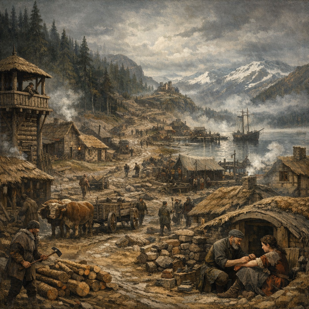 Rootthorpe has always been modest, but with the road project gaining momentum, new infrastructure is albeit slowly beginning to take shape. Expanded docks are under construction to accommodate larger vessels as lake trade grows. Stone-built storehouses, reinforced to withstand bandit raids and bad seasons, provide greater food security. The Southern Road, still in its early stages, is being cleared and marked, but it remains a dangerous and unfinished project.
