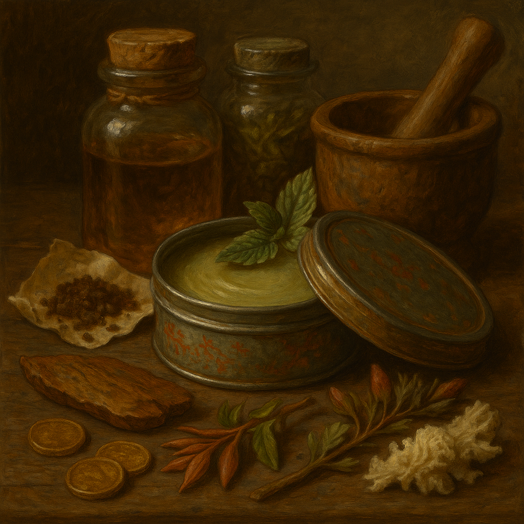 The earliest salves in recorded Everwealthy lore came from Smallfolk refugees around the region that would become Twin-Peak, who treated sand-burns and blistering rashes with cactus sap and marrow-fat; THough like many things in our history today for all we know salves predate many of the ruins we have been picking over the last 500 years by 1,000. During The Great Schism, when healing magic waned and disease surged, The Scholar's Guild began hoarding salve recipes. Many of the oldest blends were lost, burned, or locked behind alchemical wards too complex to unweave. Rural hedge-physickers and lowland midwives preserved others through song, tattoo, or memory. Some noble houses still pass down ‘blood-salve’ recipes as heirlooms, said to cure ailments only suffered by their cursed lineage. Meanwhile, in the slums and borders, salves have become a currency of care: shared between neighbors in hidden tins, or bartered in alleys for bread and protection.