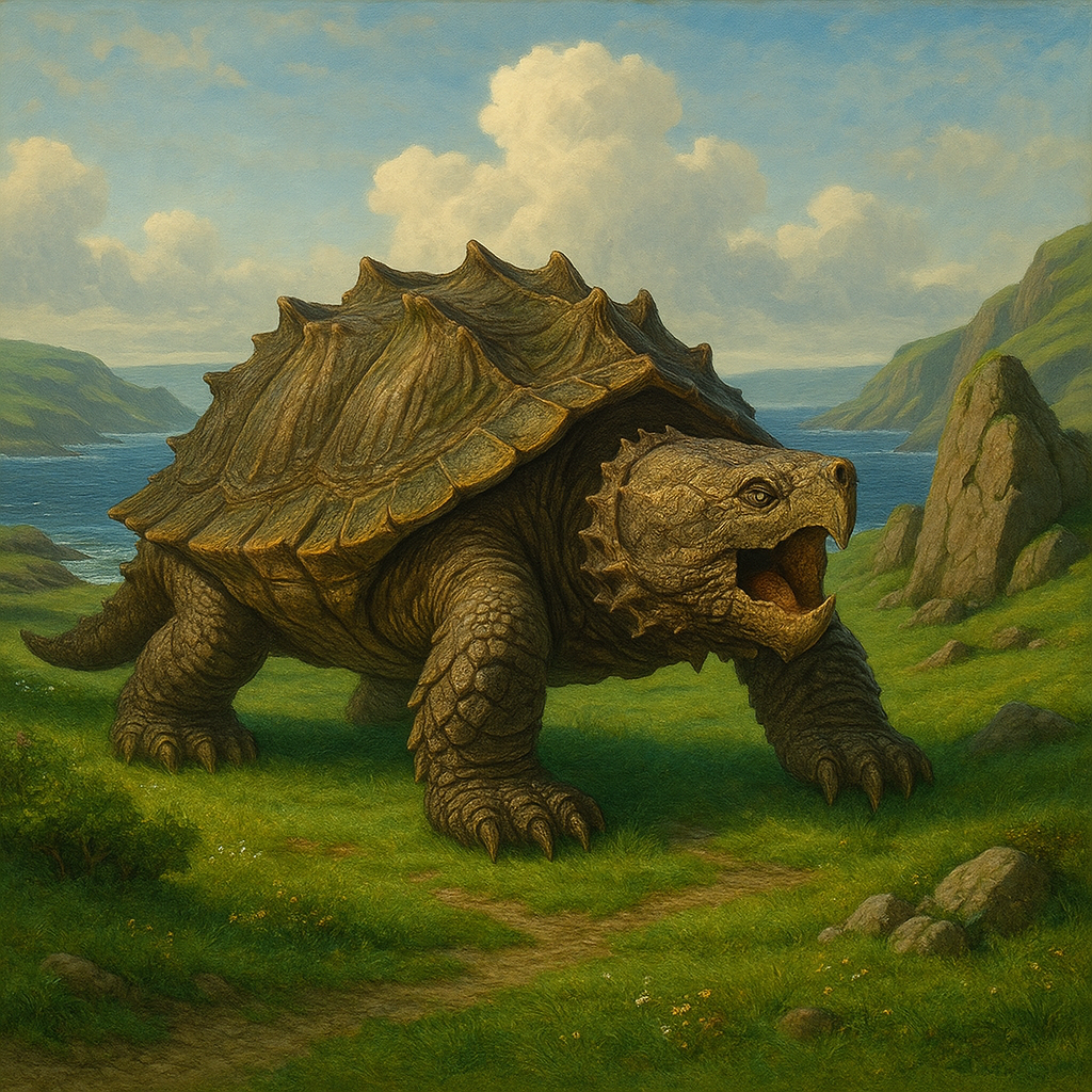 Native to Everwealth’s coastal shallows, estuaries, and the sodden reaches of The Hungering Marsh, Ship-Snap Turtles dominate areas where salt and freshwater blur. Though primarily aquatic, they are capable of surviving extended time on land, especially in verdant marshes where fish, frogs, and carcasses abound. In the wild, their presence marks a dangerous zone: docks vanish overnight, small boats found cracked open like nuts, their crews dragged beneath the murk. Yet, they are vital to the ecosystem, dragging corpses into deeper water and curbing overpopulation of other aquatic predators.