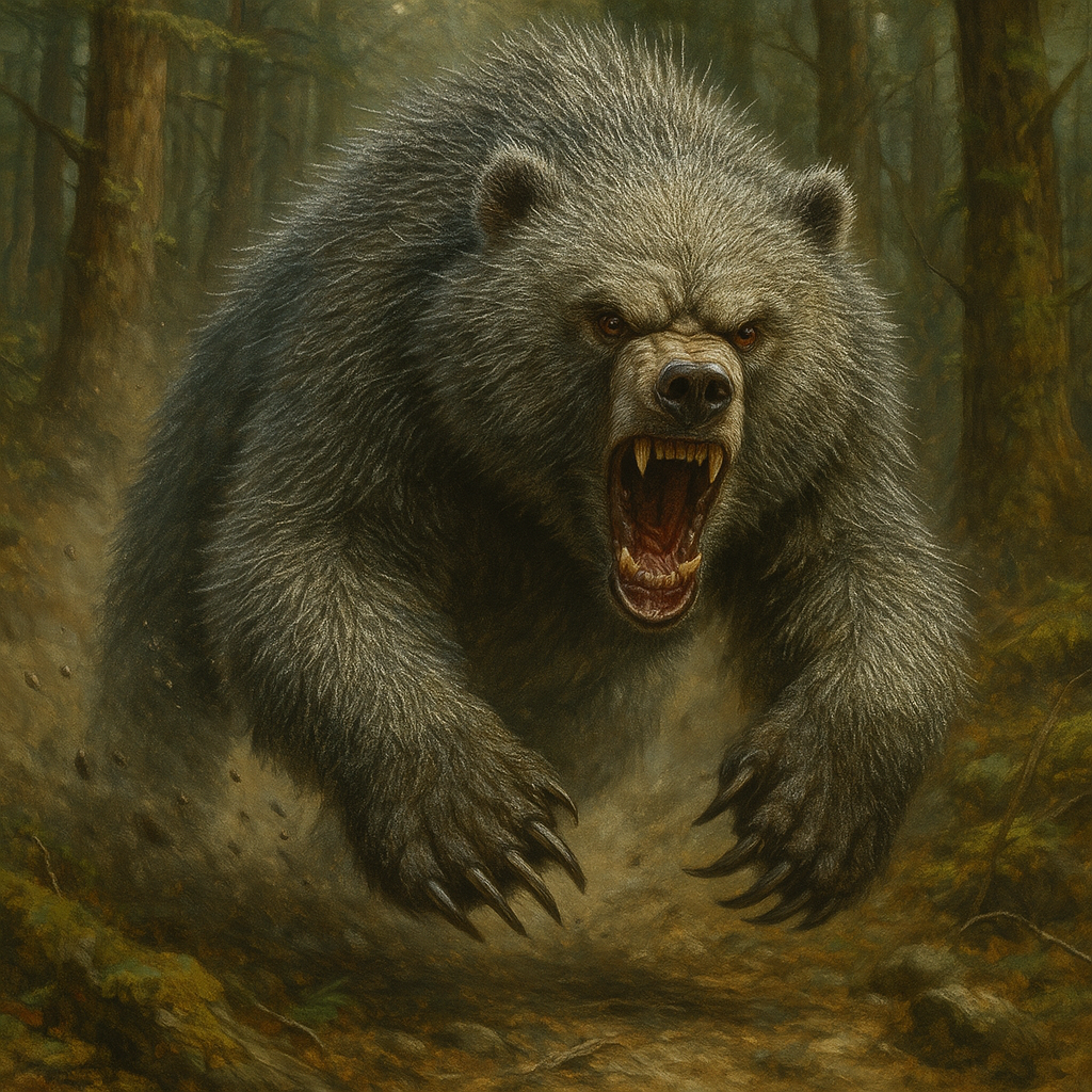 The Steel Bear shares the massive frame and strength of the Everwealthy grizzly, but with several brutal distinctions. Its namesake, belongs to the steel-gray hue of its hide, each hair like a sharpened tendril shimmering faintly when caught in direct light, resembling flexible metallic fibers more than any naturally growing hair, capable of slicing exposed skin with the slightest graze. This makes physical contact deadly; even brushing past one during a charge can leave a victim shredded. In combat, the Steel Bear’s mauling technique is amplified by the thousand cuts its fur delivers. Teeth and claws are secondary to its rolling, wrestling form, grappling prey and grinding them into ribbons beneath its crushing bulk. Its claws are slightly longer than a standard bear’s, and its teeth jagged rather than curved, allowing for tearing rather than holding. The eyes are smaller, often sunken, but become bloodshot in its frenzied state, a phenomenon attributed to a magickal inflammation of the blood.
