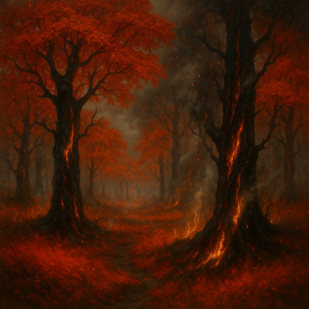 The Ashwood is a land of contradictions, a forest burned by some forgotten cataclysm, yet the flames refuse to die. It stretches for miles, a vast soot-choked wilderness of trees that's bark is scorched , ashen, yet where the trees breathe deep of the smoldering, ember-spitting fields of red grasses, cindering beneath their canopies of blood-red leaves. Standing blackened and split, their branches twisting skyward like the grasping hands of the damned. Despite its name, the Ashwood is not a graveyard of charred stumps and dead roots. It lives, in its own unnatural way, its flora and fauna warped by the infernal magicks that seep into the very bones of the land. What calamity birthed this blooming, burned place remains unknown; theories range from the explosion of a superweapon to the careless shattering of an ancient artifact. Whatever the cause, the Ashwood now exists in a state of perpetual ember, flickering with residual power that refuses to fade.Geography