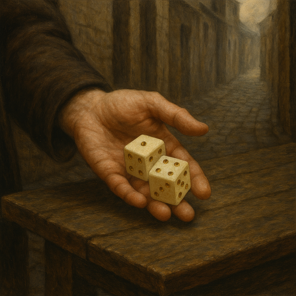 - Any Pair but Ones or Sixes: The roller’s next great gamble, trial, or combat is bent in their favor, weighted as if destiny itself leaned toward them. But every such “tilt” is marked. Three marks, and the dice claim their due, dragging the roller’s soul into the void between wagers, leaving only the cubes behind.