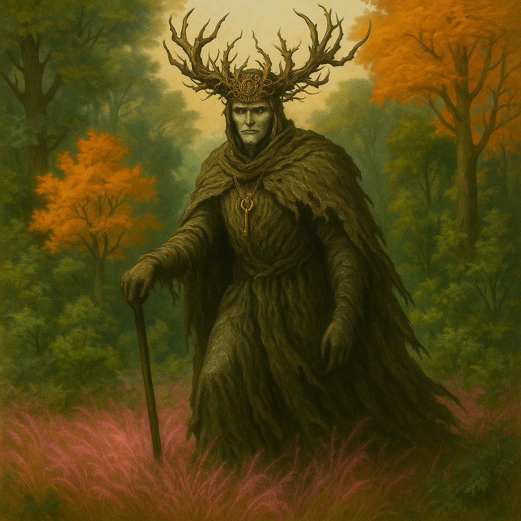 A hybrid of mythic archetypes: part eldritch sovereign, part folkloric judge, part environmental warden. He is not a ruler of people, but a ruler of land and consequence. Think: an ageless trickster-king cast in natural elements, equal parts Oberron, the Erlking, and a god that never asked to be worshipped but will be obeyed.