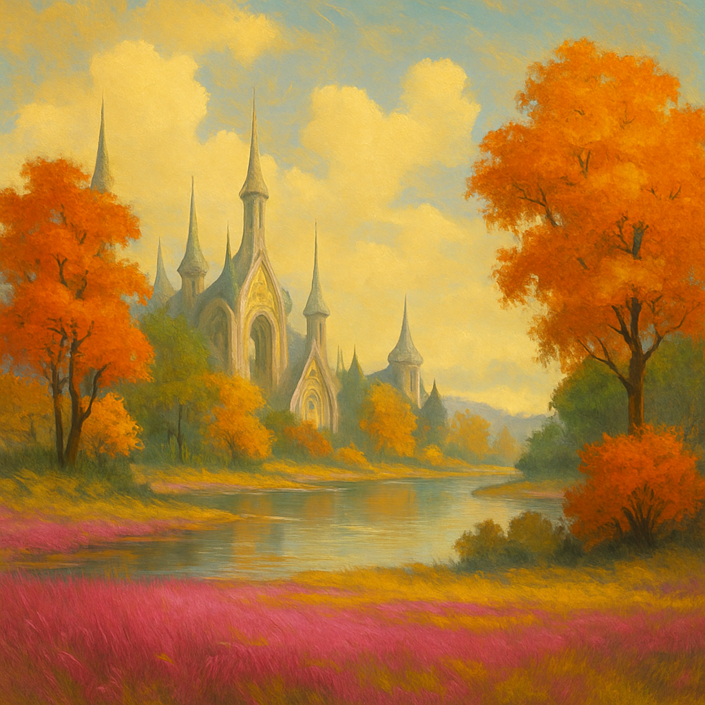 The Otherworld is an extravagant land of surreal beauty and exaggerated landscapes. Rolling hills of vibrant pink grass stretch as far as the eye can see, interrupted by crystalline rivers glowing faintly in shades of sapphire. Vast forests of towering trees with bark like polished silver and leaves in hues of iridescent amber dominate much of the horizon. The sky is an eternal dawn, glowing teal with clouds of shimmering gold drifting lazily across it. Floating islands hover precariously above the land, some slowly rotating as waterfalls spill endlessly from their edges into mist-laden lakes below. In the deeper regions, labyrinthine caves filled with bioluminescent fungi pulse faintly, creating an otherworldly hum that seems to emanate from the land itself. It is whispered that at the center of all things lies the Court Without Name, a hidden glade said to house the will of