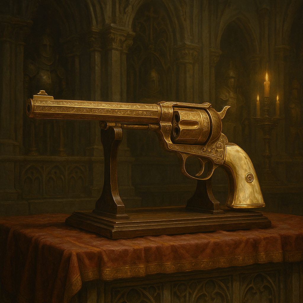 The Radiant Tongue was wrought by Saint Edravos alone. He was no smith, but guided by divine vision he became one. For forty days and nights he labored within the cathedral forge, surviving on water and sacramental bread. Each hammer-strike was answered by the toll of bells above, their resonance binding sanctity into the metal. The frame was forged of hammered gold, engraved with baroque holy designs that doubled as glyphs of protection. The grip was carved from pearlescent relic-ivory and polished in oils pressed from consecrated fruit. Into the cylinder, he carved runes with his own bloodied finger, dipped in ash and wine. When at last the revolver was finished, he fired a single shot skyward. Flame split the heavens, the bells tolled louder than they ever had, and the Radiant Tongue spoke its first judgment.