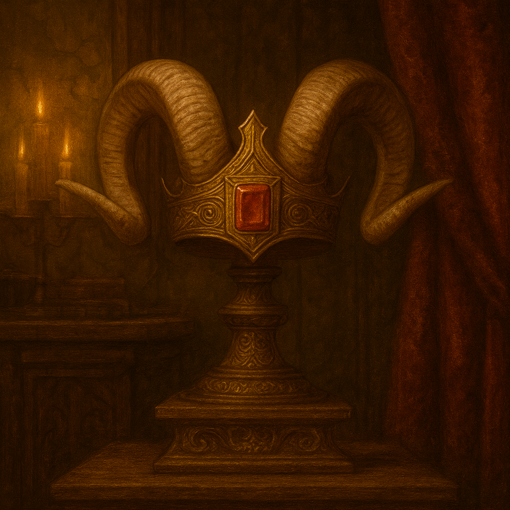 The Ram's Horns were forged in the final winter of The Great Schism, crafted by Cu, last of the famed Dwarfish Twins. His brother, Chullain, had perished as the final battles against the Elfese drew to a close, succumbing to age seemingly as-soon as he knew his people would be safe, but not a moment before, leaving Cu grief-stricken yet resolved though aging greatly himself. In honor of the alliance that helped free their kind and secure The Cloudrend Mountains for their Ironclad Republic, Cu poured his life's final work into a single object, a crown fit for the first Everwealthy king. The circlet was delivered to Ancelon’s heir by Cu himself, then the dwarf died three days later. To Dwarfs, it was both mourning gift and final proof of brotherhood. To Humans, it was a sacred contract in gold. Since its creation, the crown has been worn by every true monarch of Everwealth. It has survived palace fires, civil unrest, assassination attempts, and even a brief period of concealment during the Warlord Succession. Yet it has never once been reforged, tampered with, or replicated, a testament to the unspoken rule: Cu’s work must never be undone.