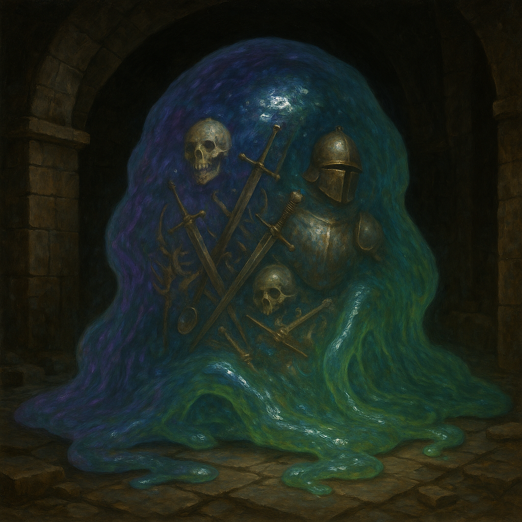 The Vireling resembles a mass of semi-viscous gel, roughly spheroid or cuboid in resting form. Coloration ranges from acidic blue, bioluminescent green, or violet-streaked indigo, always with a faint inner shimmer reminiscent of a night sky drowned underwater, what miners refer to as "graveglitter." The creature’s surface is slick, gelatinous, and entirely acidic, able to dissolve organic tissue in moments. Surprisingly, equipment, bones, coins, or stone are left intact, often suspended within the creature’s transparent mass. These remnants swirl with slow, almost balletic grace as it moves, giving it a grotesque aesthetic akin to a treasure vault full of death. It lacks organs, a brain, or skeletal structure. Its mind, if it can be called that, seems dispersed through its entirety. Some specimens form eyeless pseudopods, or thin, whip-like tendrils when disturbed.