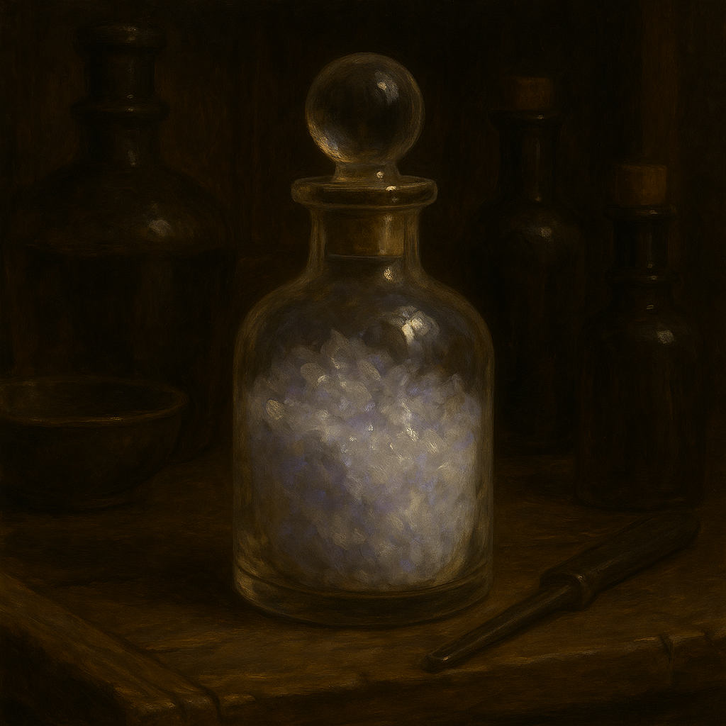 Wraith Salts are composed of condensed ectoplasmic residue left behind by intense spiritual trauma, often sites of mass death, tragic rituals, or haunted battlefields. They are light to the touch, but unnaturally cold. Exposure causes shivering, hallucinations, and in rare cases, “echo burns”, bruises left by no visible force. Salt reacts violently with necrotic energy or soul-infused materials.