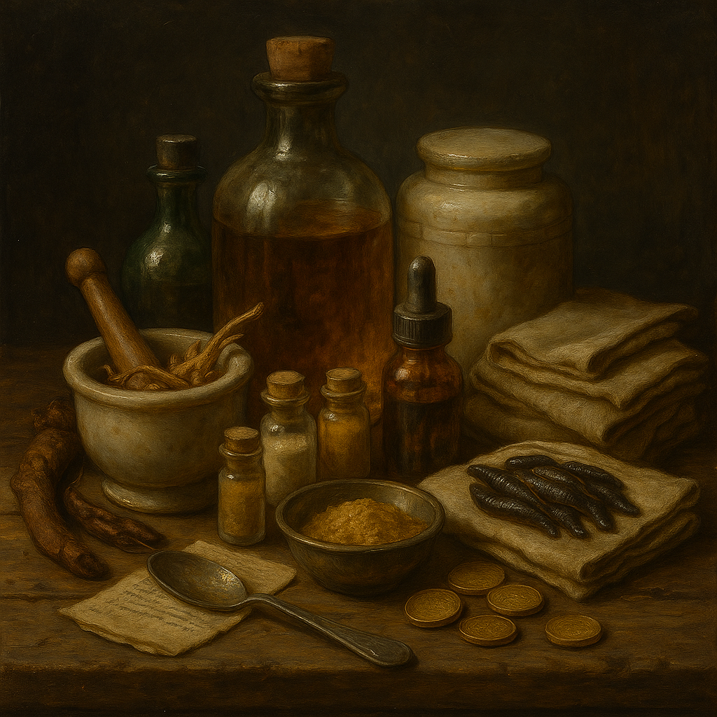In Everwealth, medicine is a patchwork of desperation, superstition, and half-remembered science. While the learned few have access to a blend of alchemy, magicks, and relics from before The Great Schism, though far more rugged than such fields once were during The Lost Ages the Schism brought to an end, common folk rely on crude village doctors, oft called 'sawbones' who arm themselves against affliction with little more than leeches, whiskey, and a hacksaw. Infections often worsen under such care, leading many to endure chronic pain or untreated illnesses rather than risk the ministrations of these ill-equipped healers. Magickal healers like Clerics, where they exist, are either cloistered away, heavily regulated, or lack the means to disseminate their knowledge, leaving vast regions without competent medical aid. The allure of ancient remedies from the Lost Ages tempts many to The Grandgleam Forest, seeking miraculous cures. However, these ventures often unearth hazardous practices, asbestos touted as a healing mineral, methamphetamine tablets mistaken for revitalizing tonics in capsule form, or lobotomies revered as cures for mental ailments. Such misinterpretations, born from romanticized views of the past, lead to the widespread adoption of treatments that are not only ineffective but often detrimental. The belief that the ancients possessed superior knowledge blinds many to the dangers of these archaic methods, resulting in a medical landscape fraught with peril and misunderstanding. In this environment, true medical expertise is scarce and often reserved for the elite or powerful guilds. The general populace navigates a treacherous terrain of dubious surgeries and charlatan cures, where the line between healer and harm-doer is perilously thin. As a result, medicine in Everwealth has become a field where hope and hazard intertwine, and the quest for healing is as likely to lead to ruin as to relief.