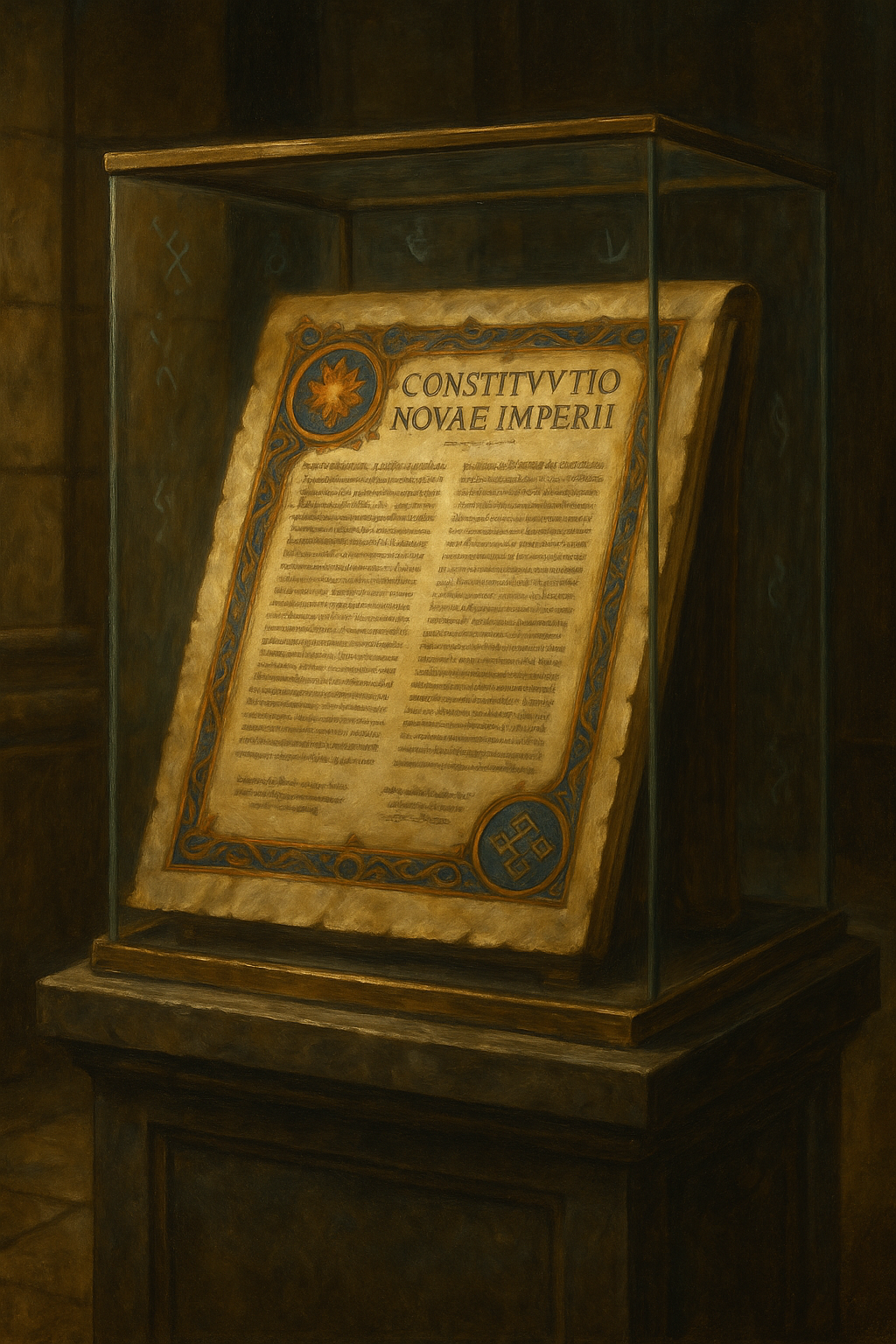The Constitutio Novae Imperii is one of the most widely disseminated and symbolically visible documents in Imperial history. The original master copy — written in silvered aether-ink upon consecrated vellum — is enshrined within the Basilica of Nova Roma, displayed behind crystal warding panes and guarded day and night by the Custodes Basilicae. Pilgrims, scholars, magistrates, and legionaries visit it as both a civic relic and a sacred testament.