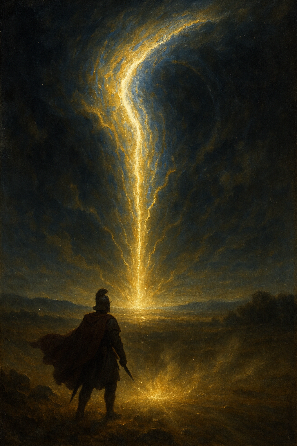 Moments before transition, the light collapses inward, forming a sphere of blinding radiance. Gravity stabilises, the wind falls dead still, and for a heartbeat the world is silent.