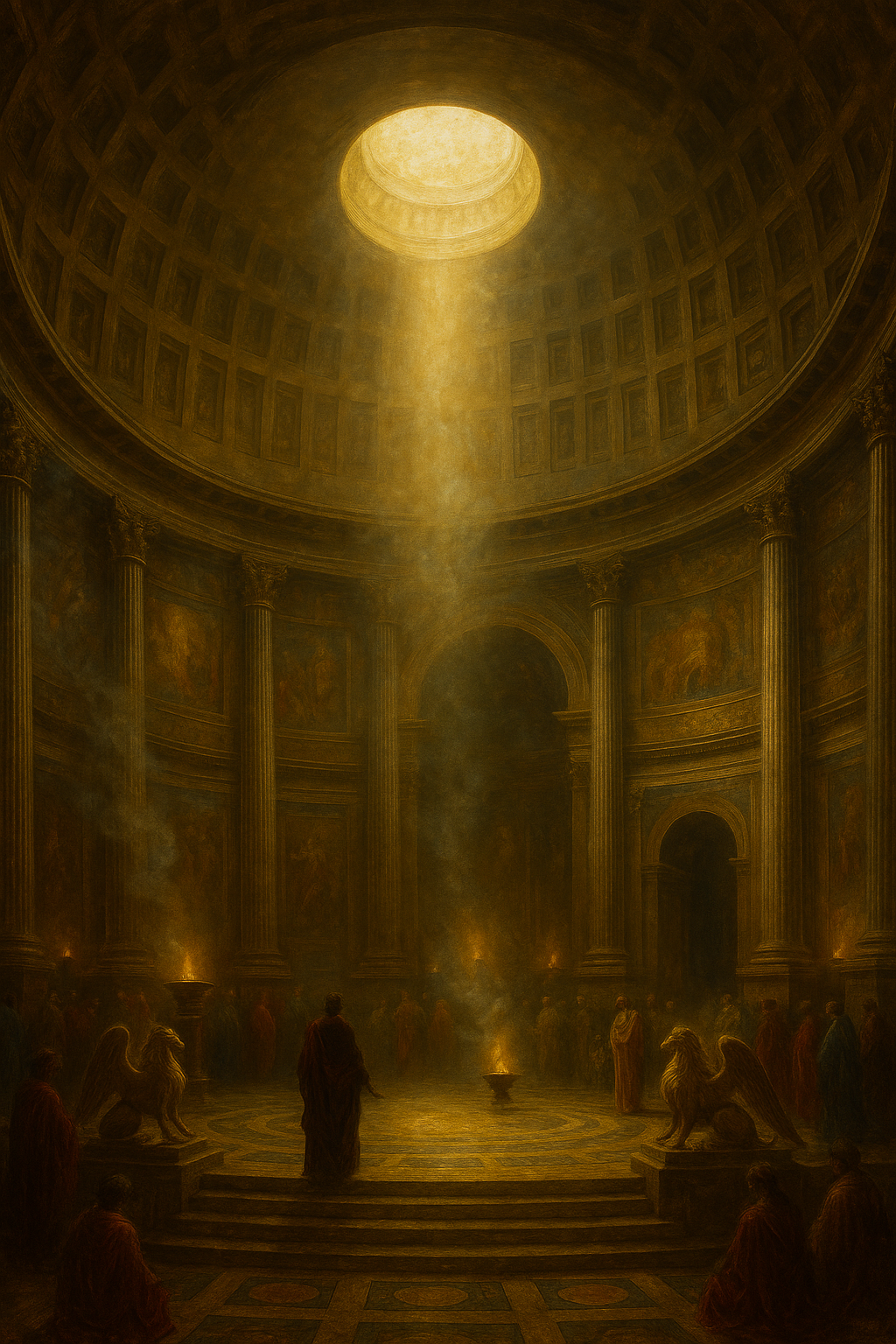 The structure unites the functions of shrine, tomb, and monument. Above ground rises a grand temple whose dome commands the skyline, its oculus flooding the interior with golden light. Beneath lies a labyrinth of crypt chambers, each dedicated to emperors and those rare figures raised by senatorial decree to the rank of the Honoured Dead. These lower halls are rich with funerary inscriptions, sculpted sarcophagi, and quiet alcoves where attendants recite the daily litanies of remembrance.