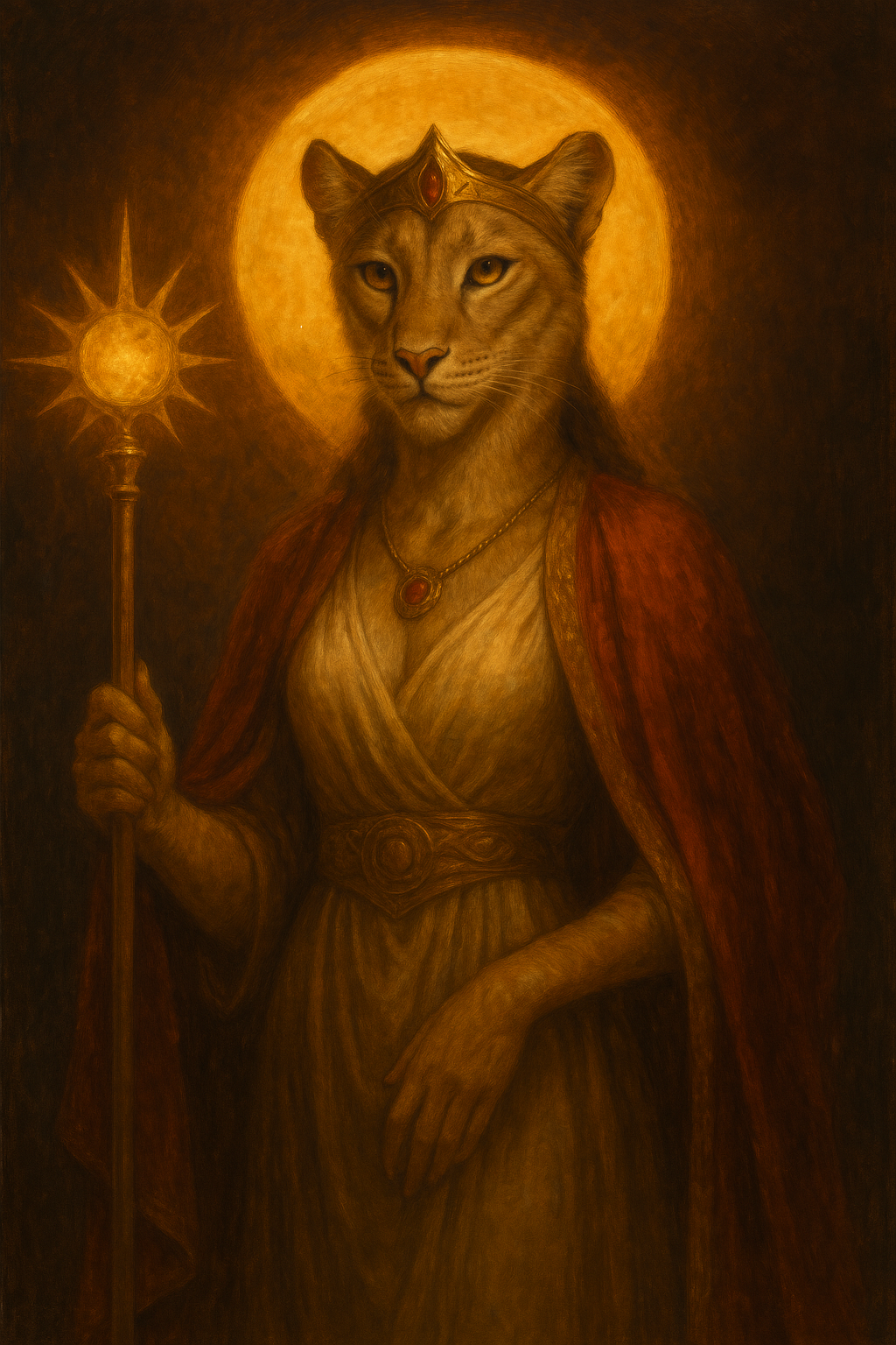 Nala Solauria, Sol-Regina of the Brass Cities and anointed Daughter of Sol Auria Aeterna, stands as one of the most radiant rulers of the present age. Born into a matriarchal lineage that traces its authority to the first dawn of her people, she ascended the throne at just five years old, crowned beneath a sky gone blood-gold with omen. Her mother’s sudden and suspicious death left the realm in the hands of a regency council, but even in childhood Nala bore the unmistakable signs of divine favour: a faint shimmer of red-gold light along her fur, and an unblinking steadiness in her eyes that court chroniclers would later describe as “the sunrise waiting to happen.”