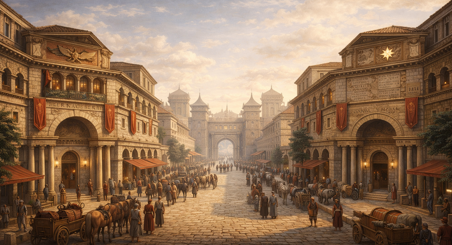 The rise of long-distance trade and formal diplomacy further entrenched Vicus Septentrionalis’ role. Inns grew larger and more specialised, catering separately to bulk traffic, high-status guests, and extended stays. Rivalries emerged alongside consolidation, most notably between the district’s great inns, whose competition mirrored the increasing stakes of reputation and access at the city’s threshold.