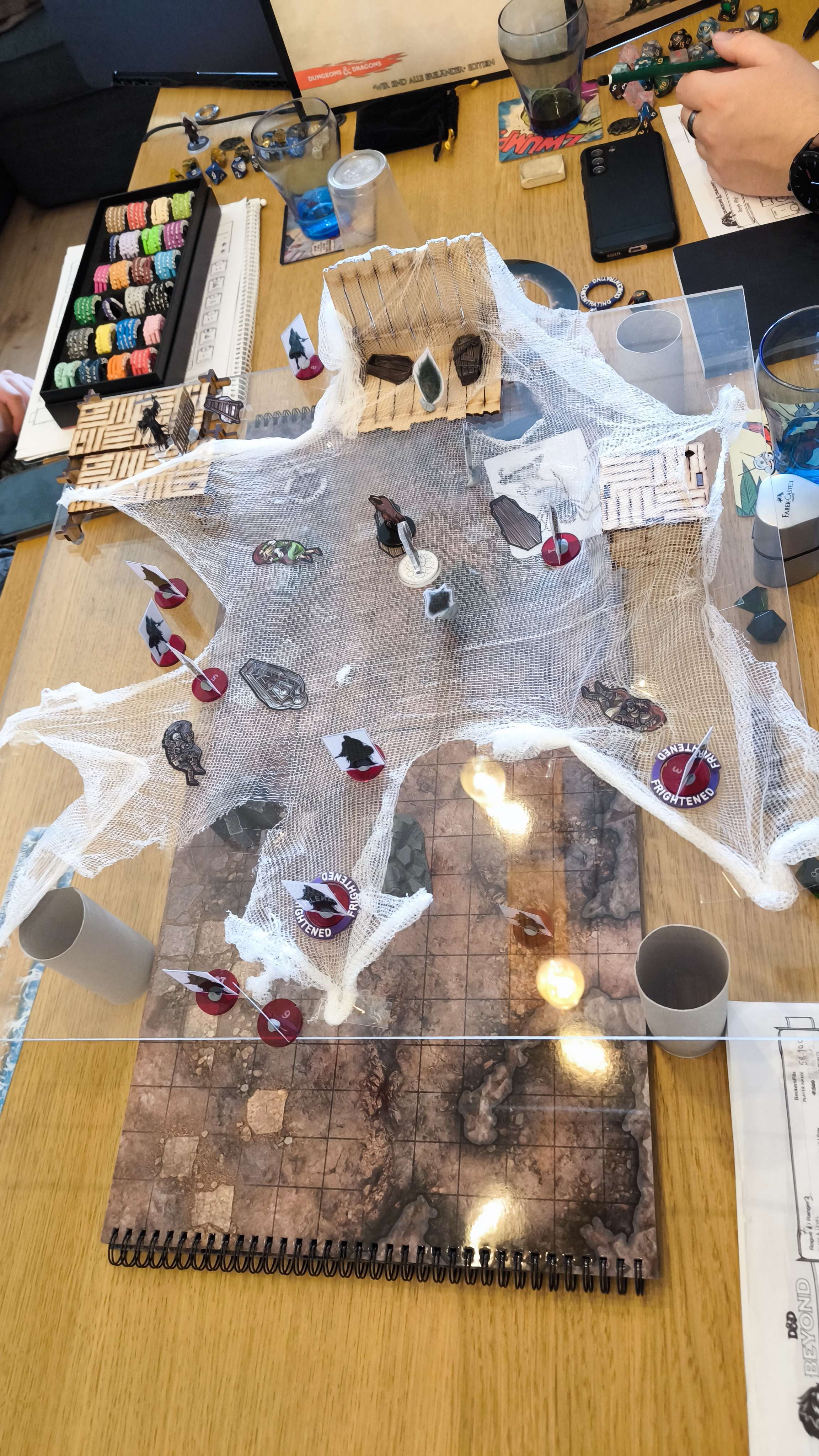 Ihr befindet euch auf einem riesigen Spinnennetz, ca 10 Meter über dem Boden. Scheinbar seid ihr etwas abseits des Bleichghul-Basars, aber immer noch im Tunnelsystem. Ophelia sieht, wie nach und nach auf dem Spinnennetz vertrocknete, eingewebte Zombies aktiv werden und auf die Kokons in denen sich die anderen MISTY STEPPERS befinden zuklettern - wie Spinnen! (Urks)