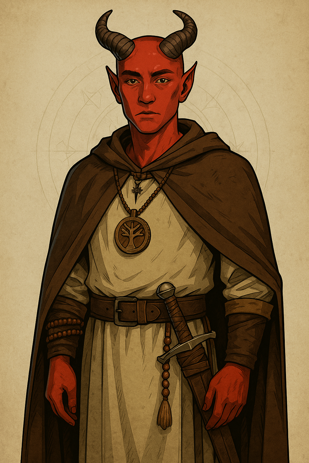 Brann is a tall, broad-shouldered tiefling with dusky red skin and curling, ram-like horns polished to a shine. His eyes are golden and calm, betraying a steady presence. He wears a well-kept brown cloak over simple but sturdy priest’s garb, with a wooden symbol of Erastil carved from river driftwood. His hands are calloused from both labor and battle, and he often smells faintly of woodsmoke and herbs.