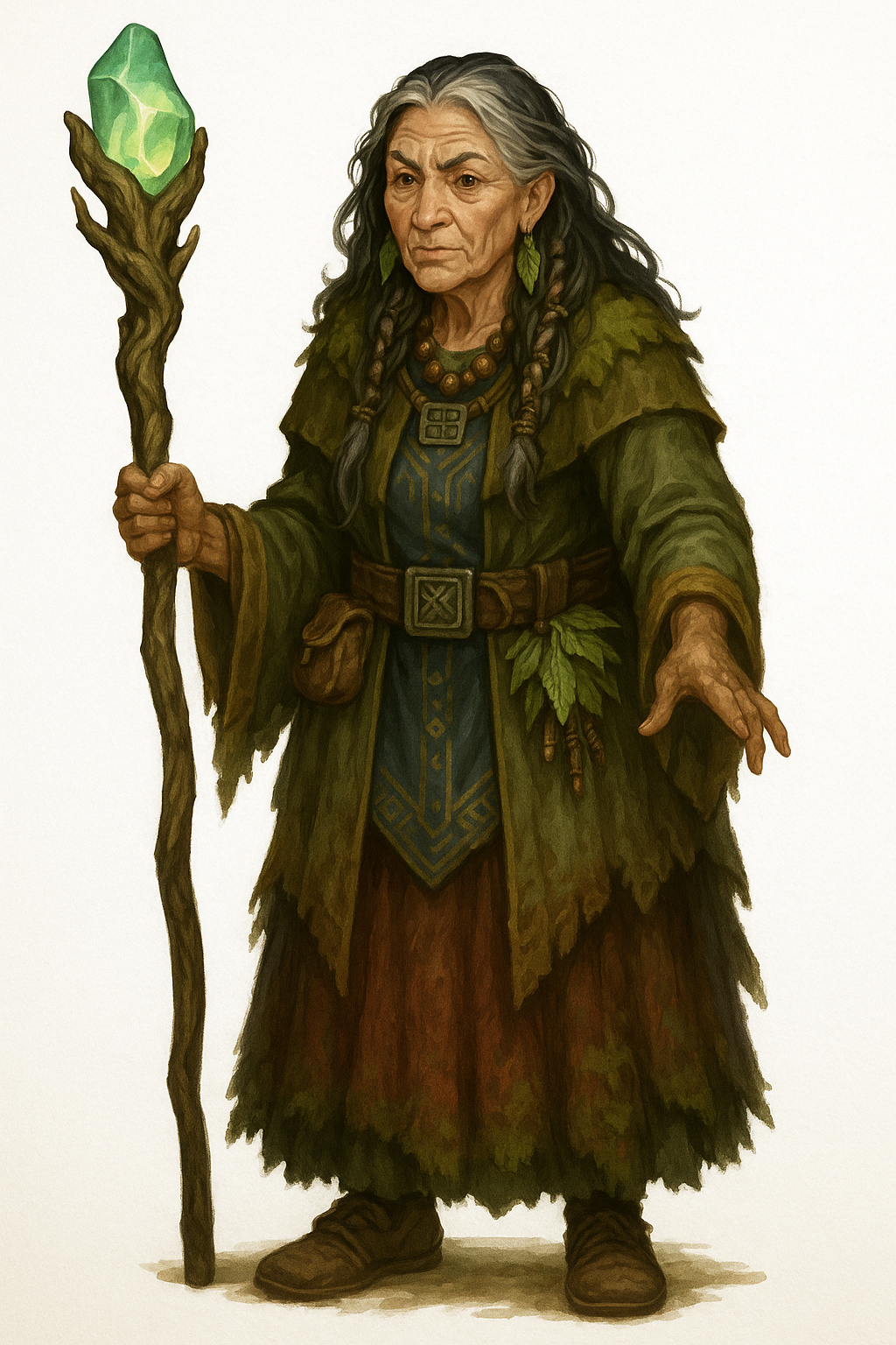 Esmerelda is an elderly human woman with long, silver-streaked black hair often woven into braids threaded with moss and beads. Her green-grey eyes glimmer with quiet amusement, yet behind them lies an unsettling weight of knowledge. She dresses in layered, practical robes stitched with bark, feathers, and symbols that seem more mathematical than mystical. Her staff is a gnarled root capped with a faintly glowing crystal shard.