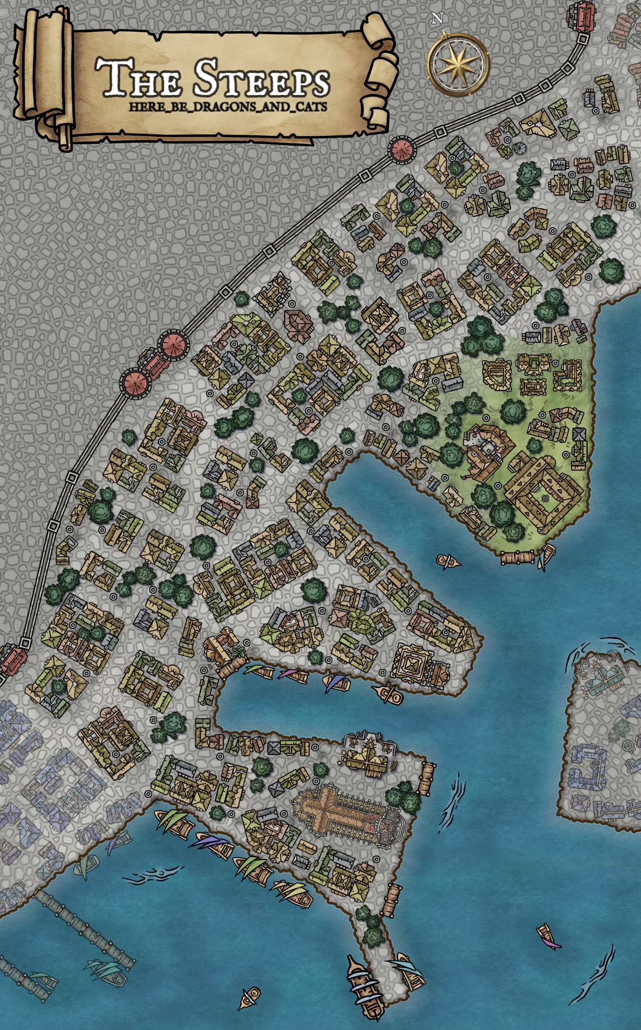 - The Steeps: A sloping, crowded area full of cramped buildings and shops, leading down to the Docks.