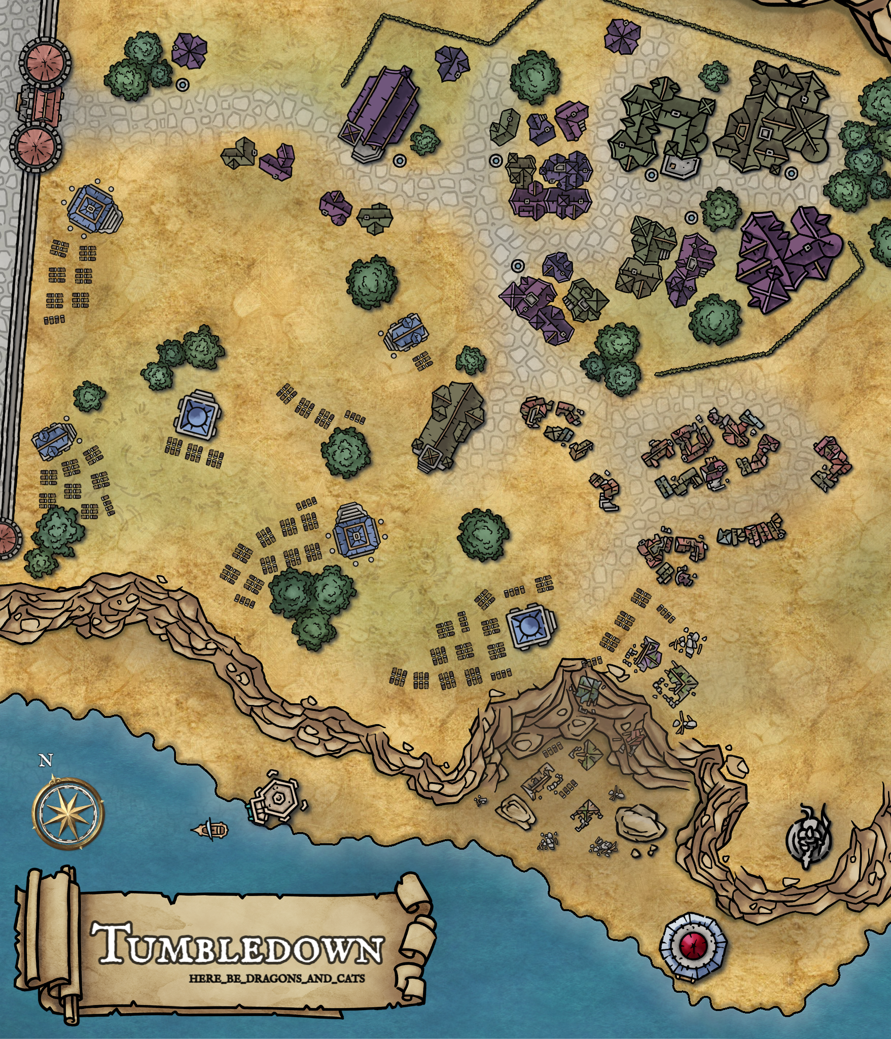 A sprawling Outer City settlement south of Baldur's Gate, filled with refugee camps, fisheries, river-powered mills, and makeshift homes of the city’s poorest. Smugglers, known as the Rivington Rats operate in the area. Markers only.