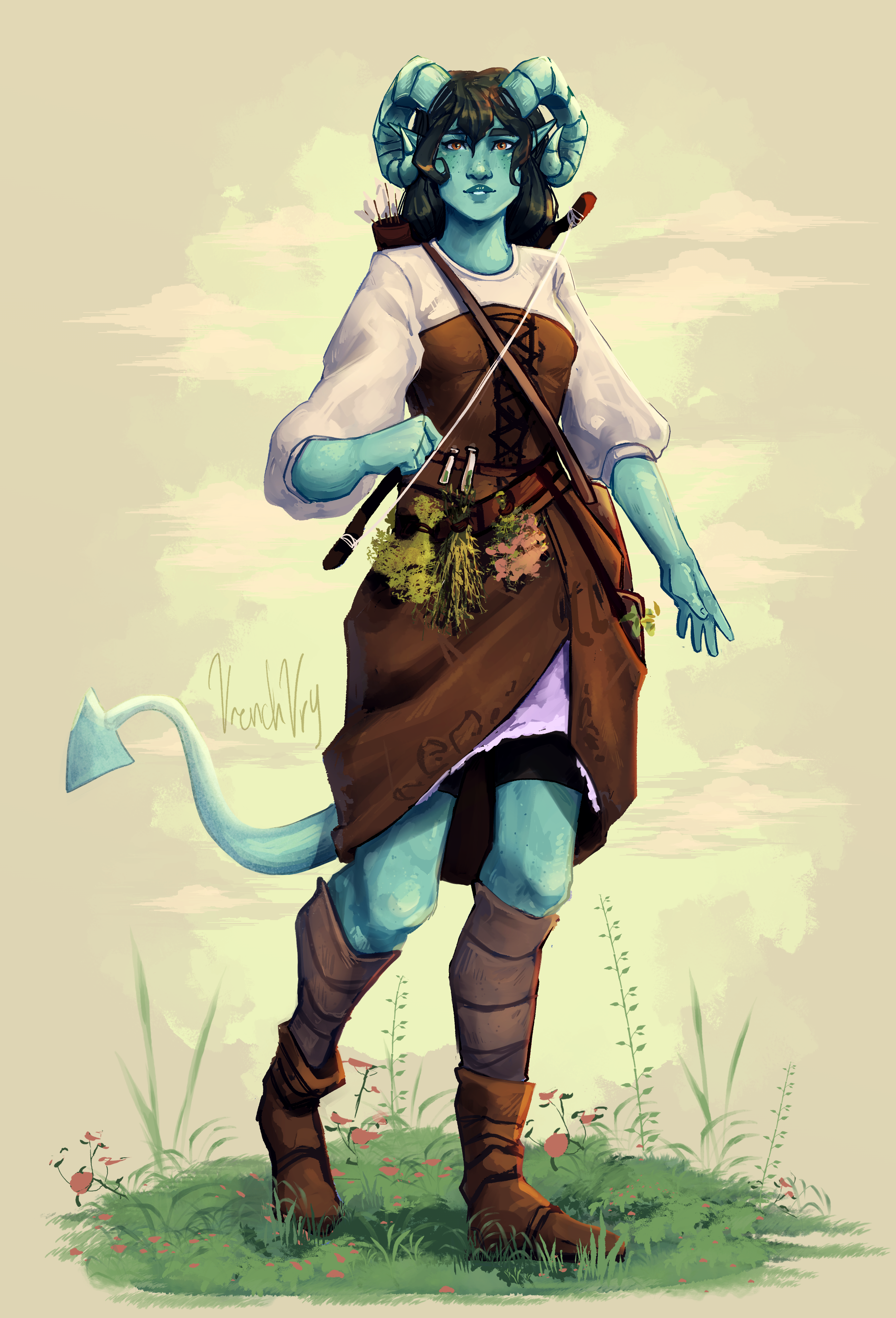 Calliope is a tall and beautiful tiefling with light blue skin and curling horns, with short brown hair and red eyes, she is very athletic due to her time spent outside.